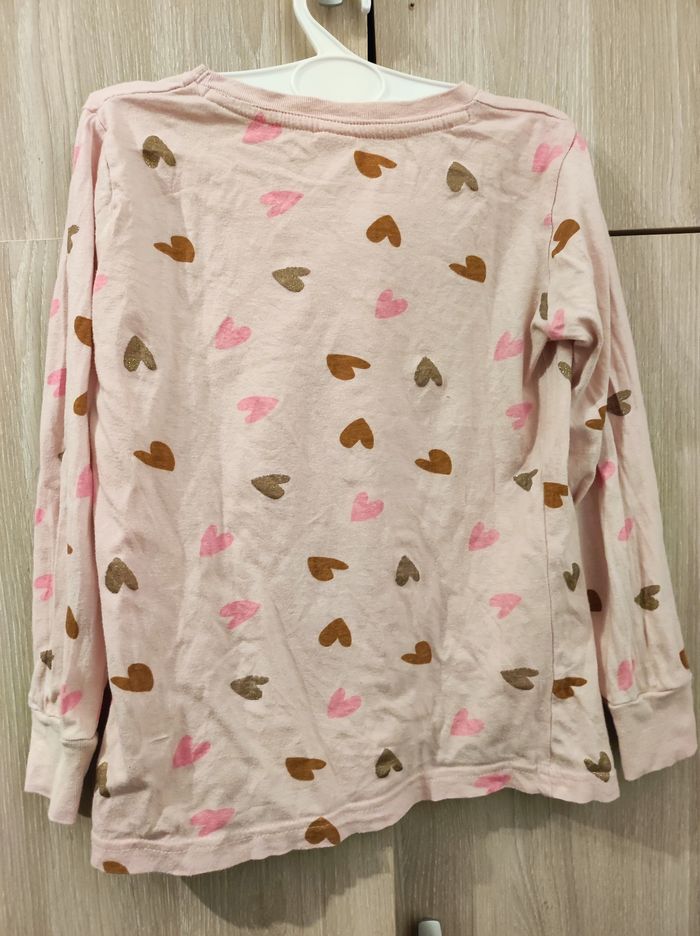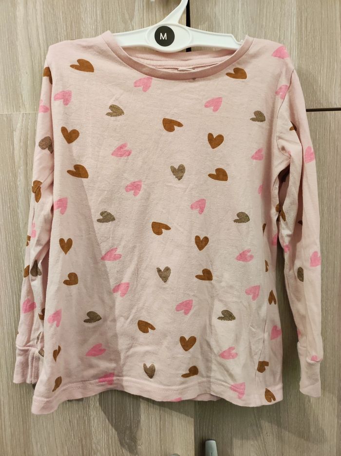Sweatshiirt / sous pull T 122 - 128 cm / 7-8 ans Marque zeeman ( sans étiquette je l'ai coupé) Col rond. Manches longues. Coloris rose pâle avec coeur imprimé marron, rose fluo et paillettes doré. En coton Parfait état. dans étiquette marque et matiere.
