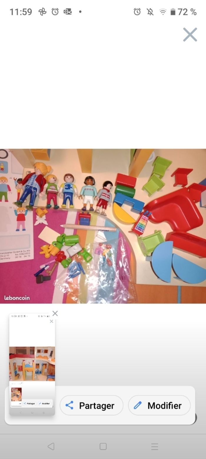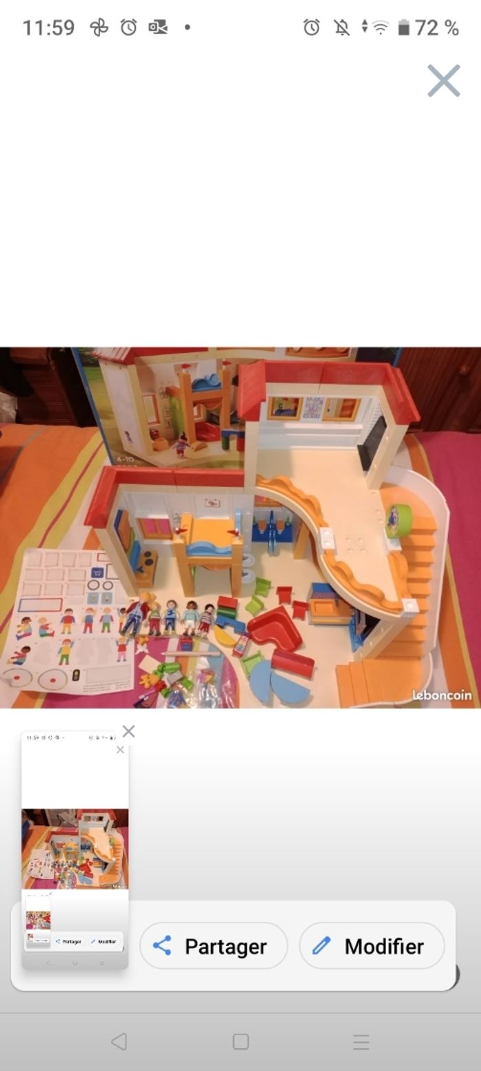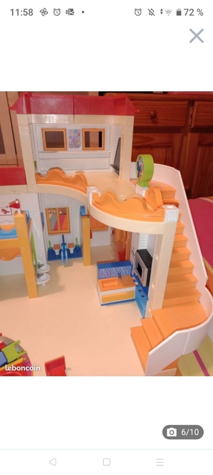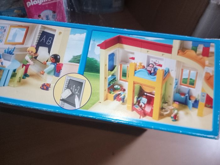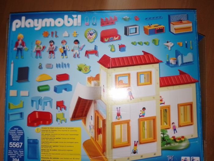 5567 garderie crèche Playmobil En très bon état Boîte en bon état 1 banquette orange et 1 bleu au lieu de 2 bleu Il aurait pû être complet manque juste 2 petits élastique (lanière) 30215063 des 2 petits sac a main