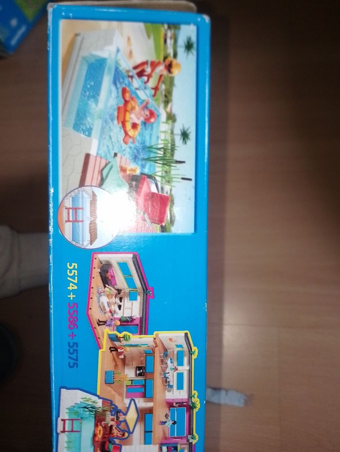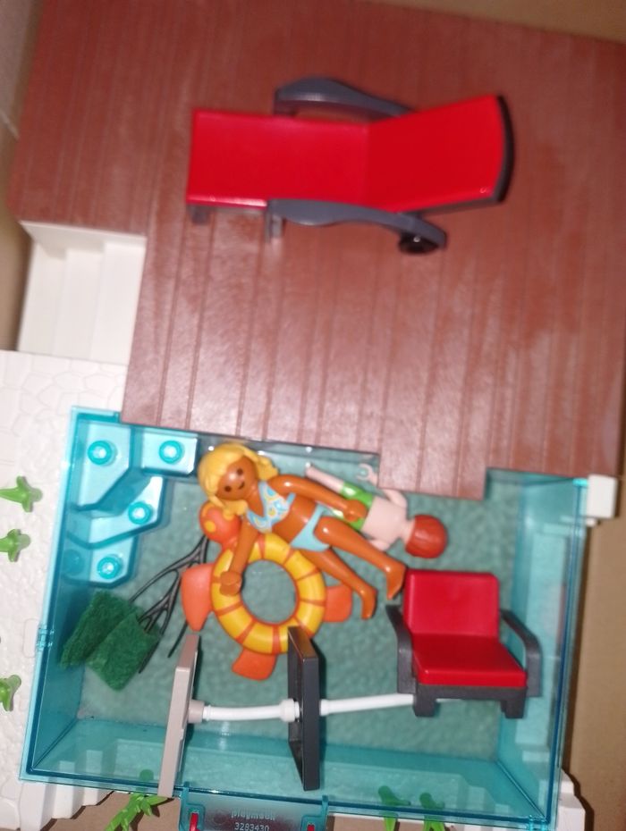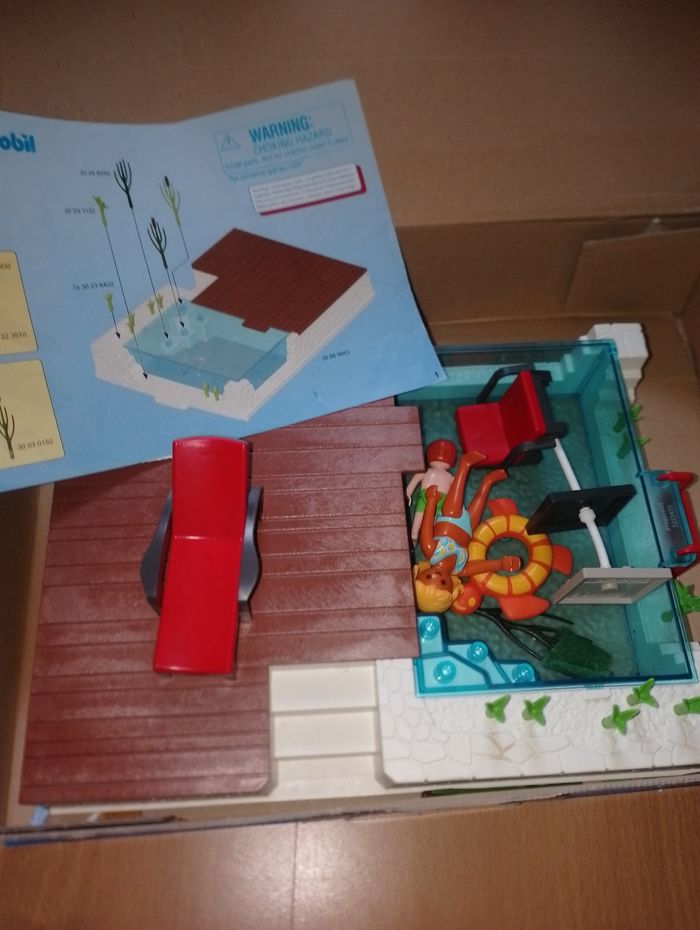 Playmobil 5575 city life piscine et terrasse Bain de soleil en vacance Il aurait pu être complet mais manque les lunettes de soleil noir et le spray jaune qui peut être remplacer par un pitch bleu sans autocollant Boîte en bon état