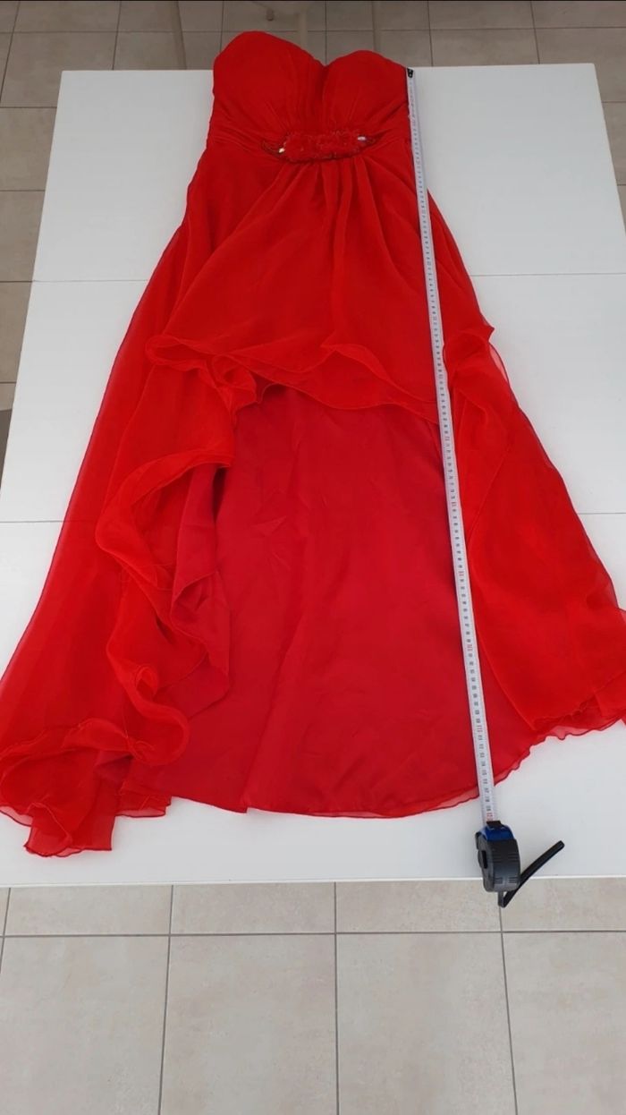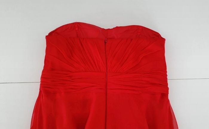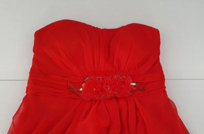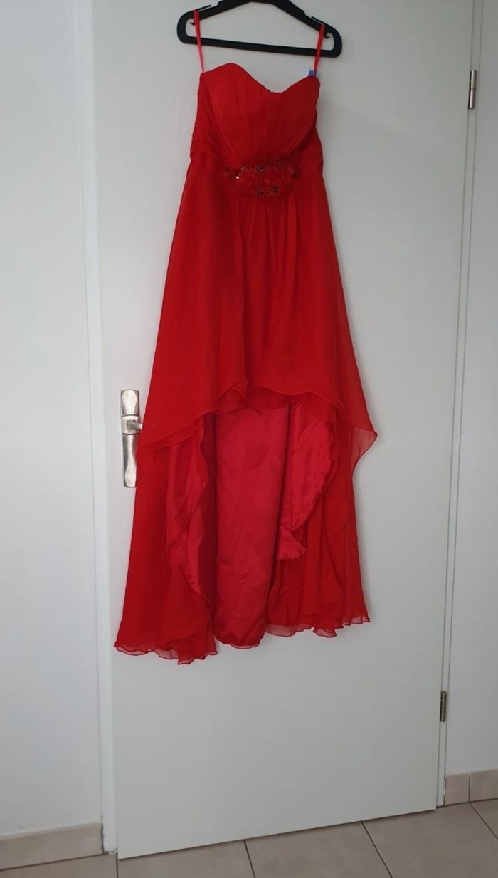 Robe bustier rouge Courte devant et longue derrière En 36, portée 1 fois Avec une fermeture éclair dans le dos Quelques fils tirés et un peu déchirée en bas, mais ça ne se voit pas quand on la porte