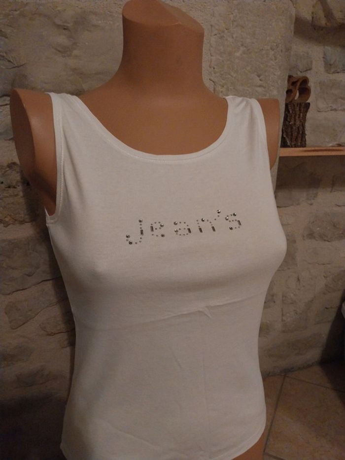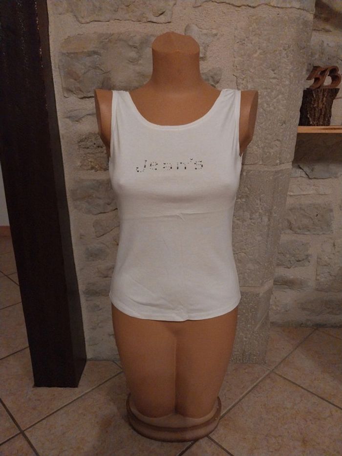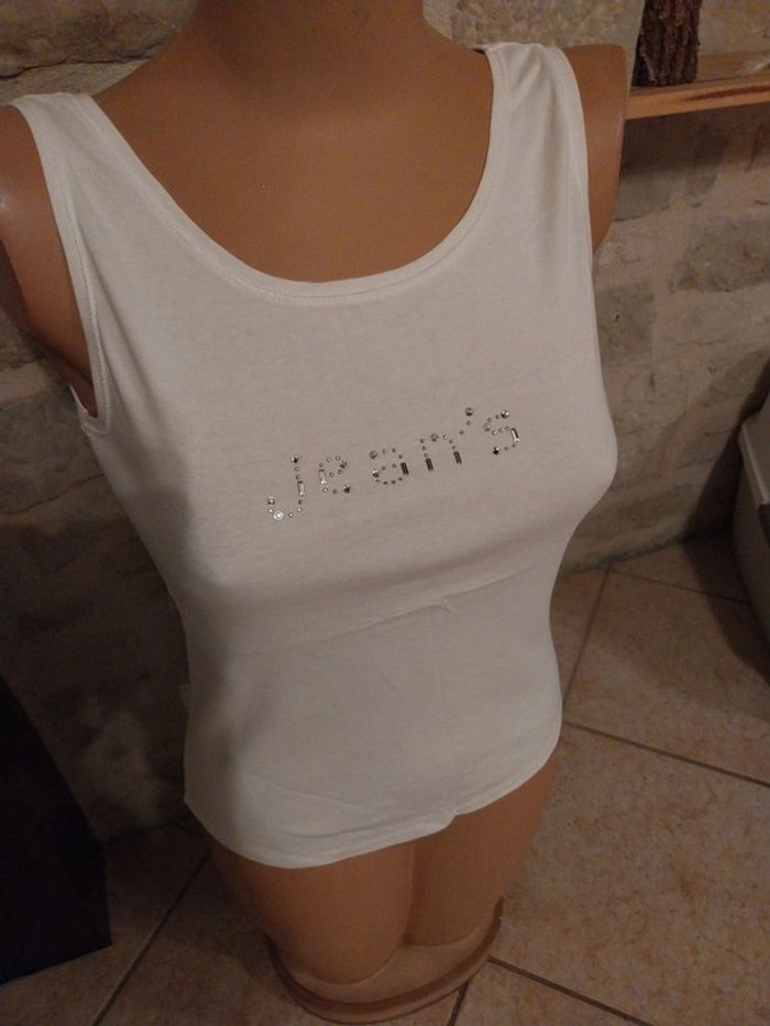 Nous mettons en vente ce magnifique débardeur femme DPM. paillettes argenté sur le devant. Taille M. Débardeur très chic.