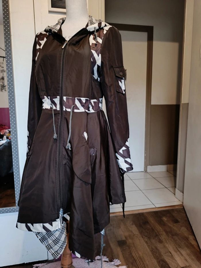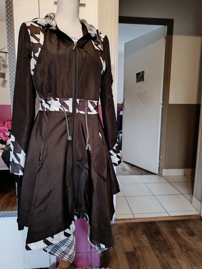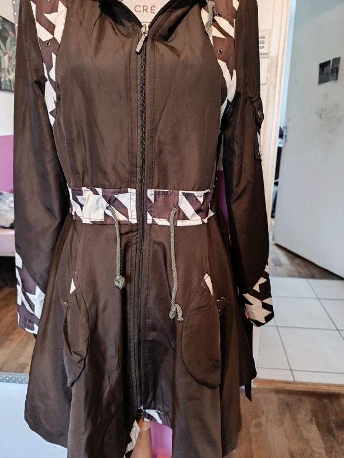 Parka fin CRISLY Marron & beige Fermé par zip Lien à la ceinture pour un effet cintré si on le souhaite Poches Capuche Doublé imprimé tartan 100% Polyester TAILLE 40 TRES BON ETAT Allez voir mes autres ventes!