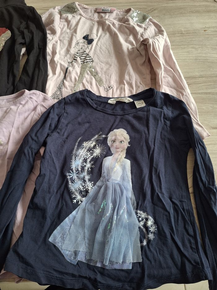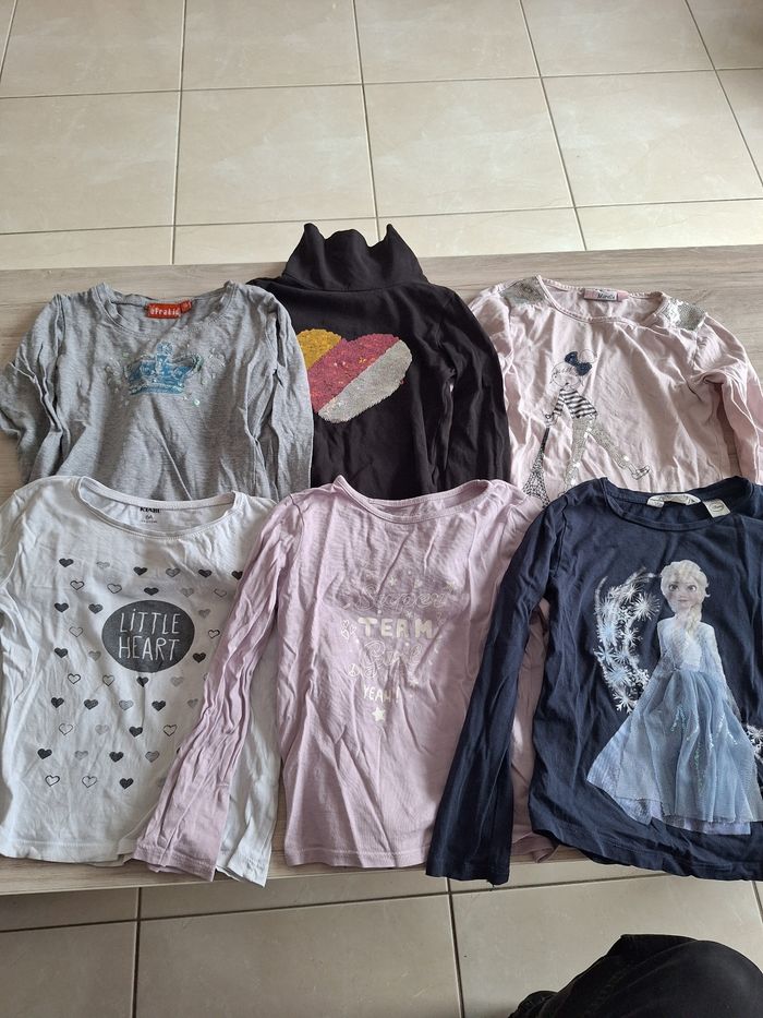 Lot de 6 t-shirts taille 6 ans En très bon état juste le rose en bas qui a un petit accroc sur la manche visible sur la photo La reine des neiges Taille 4-6 ans Le lot est en très bon état général
