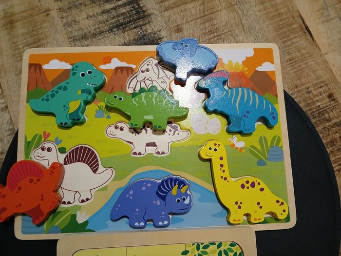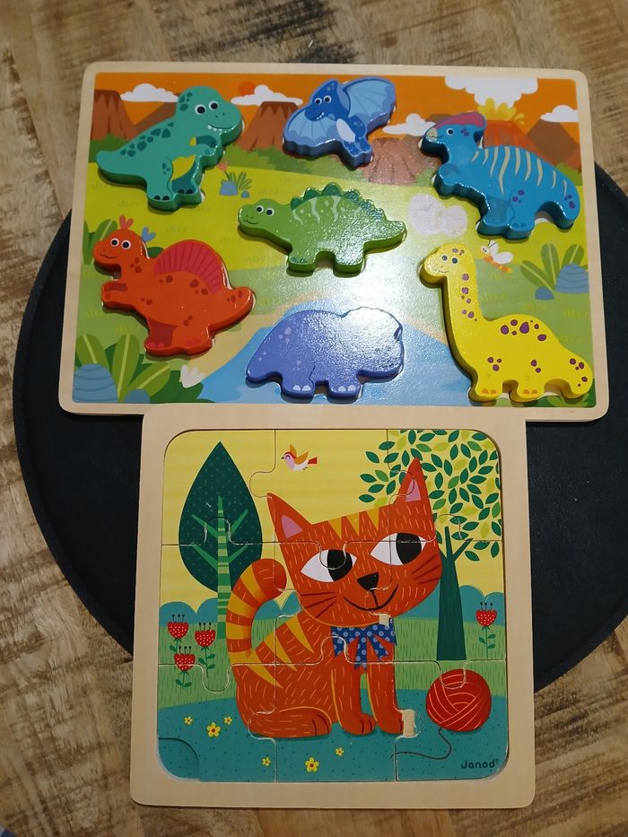 Vends lot 2 puzzles en bois 1 thème chat marque Janod 1 thème dinausores à encastrement Très bon état general