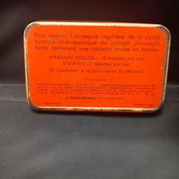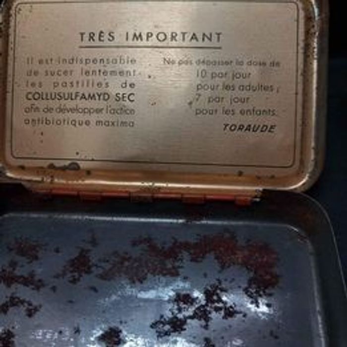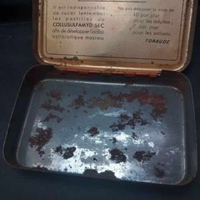 Ancienne boîte de médicaments Marqué Collusufamyd sec Matière métal Couleurs beige, noir et orange État moyen voir photos Dimensions approximative : 9,5cm de long : 6cm de large : 1,5cm de haut