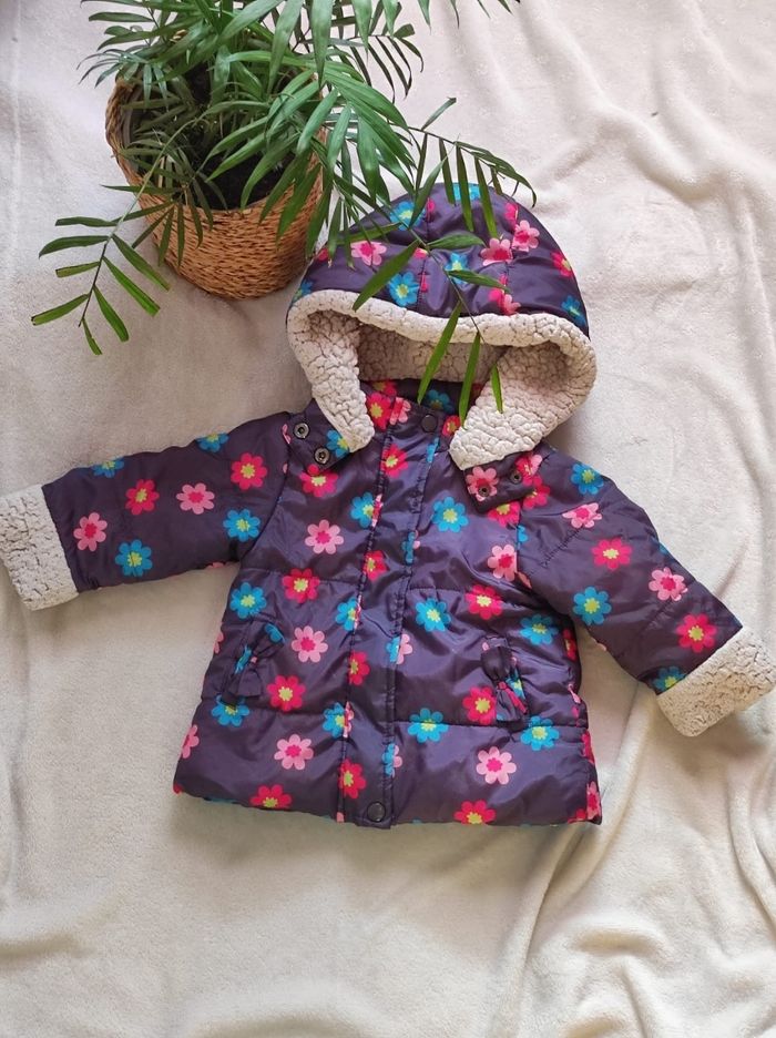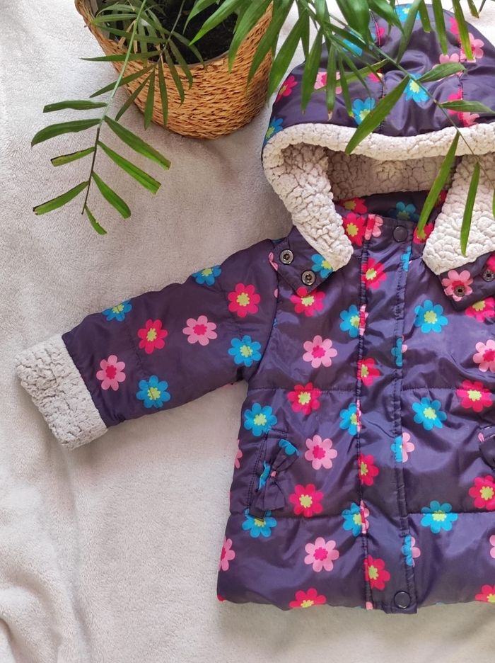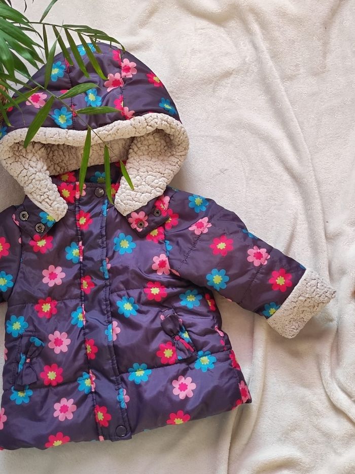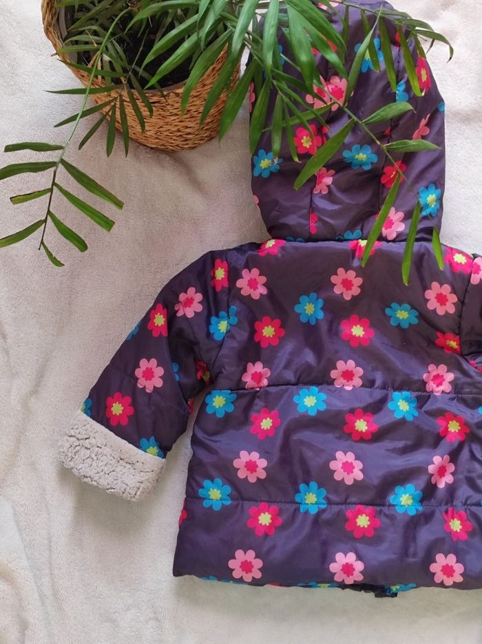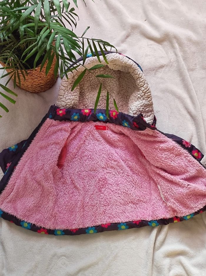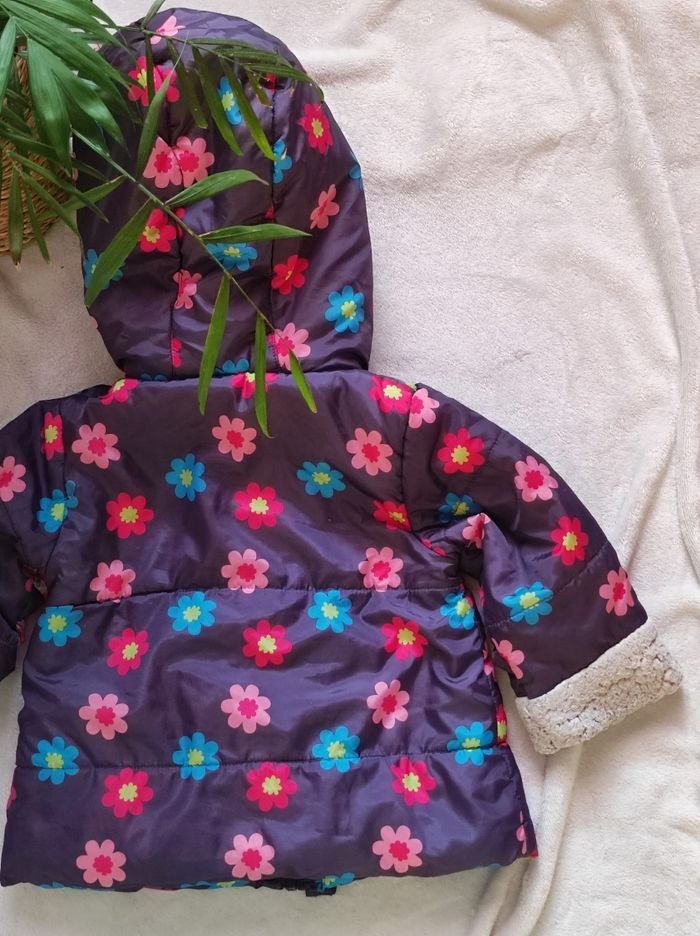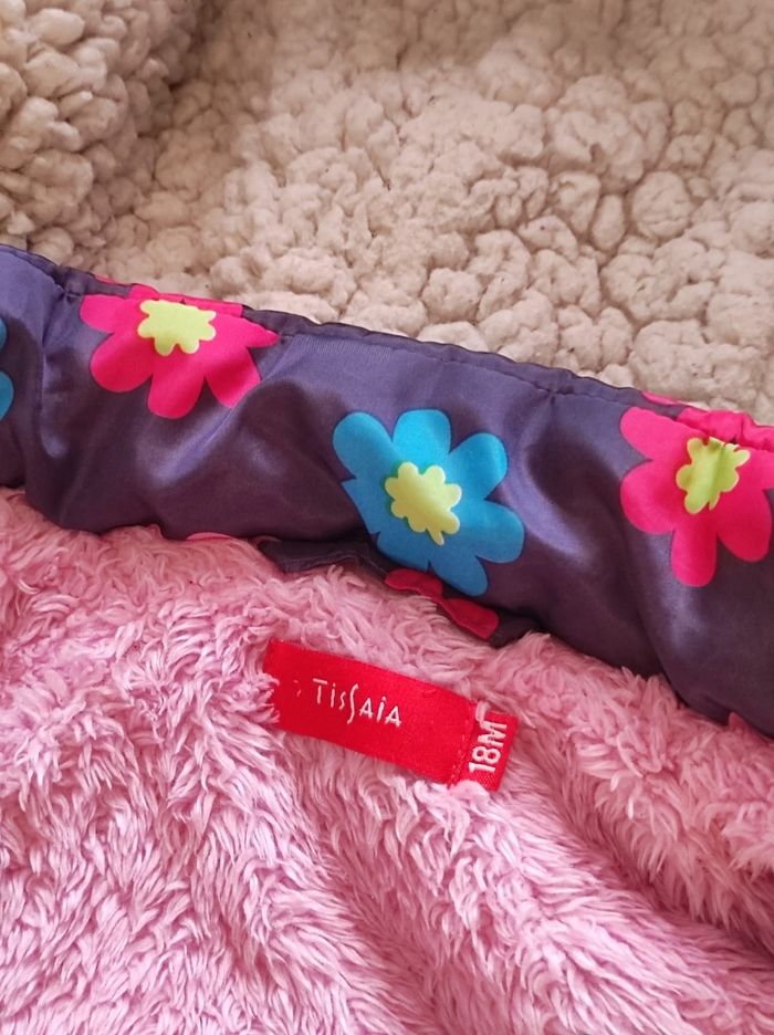 manteau à motifs fleurie sur fond gris ( et non violet) et intérieur doublé polaire rose et blanc de chez tissaia en 18 mois. Ni tâches, trou ou déchirures seul petit bémol au niveau du bout des manches la partie polaire n'est plus aussi parfait (cf photo).