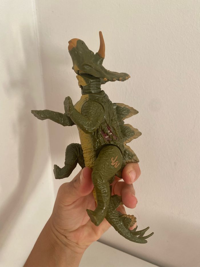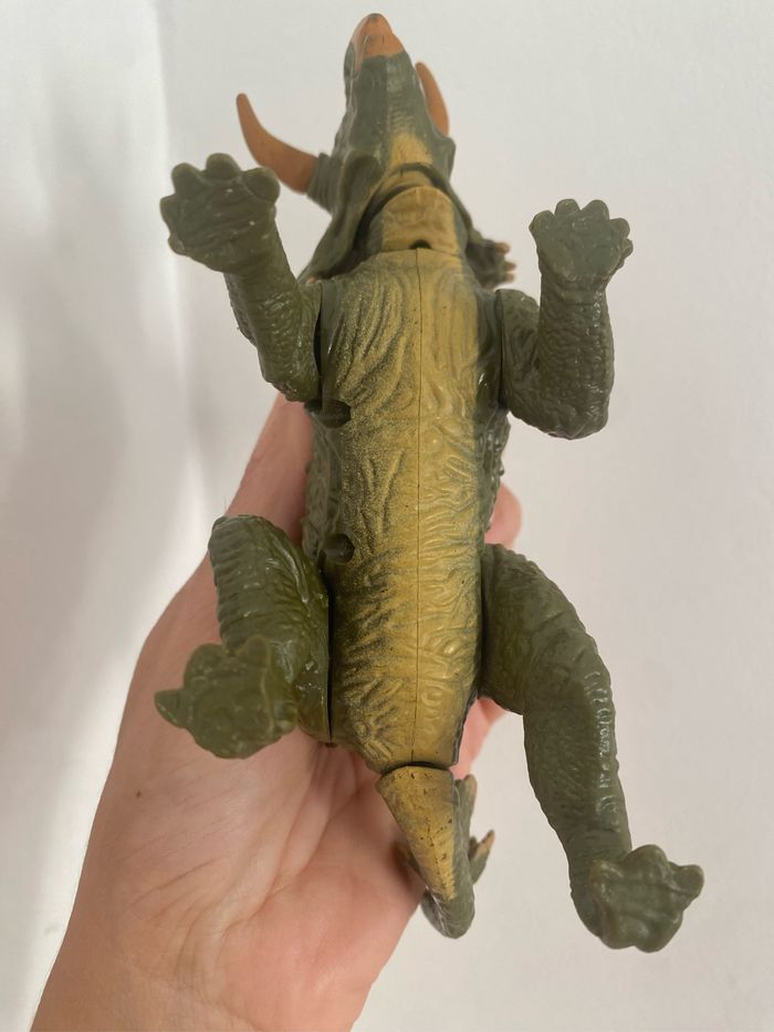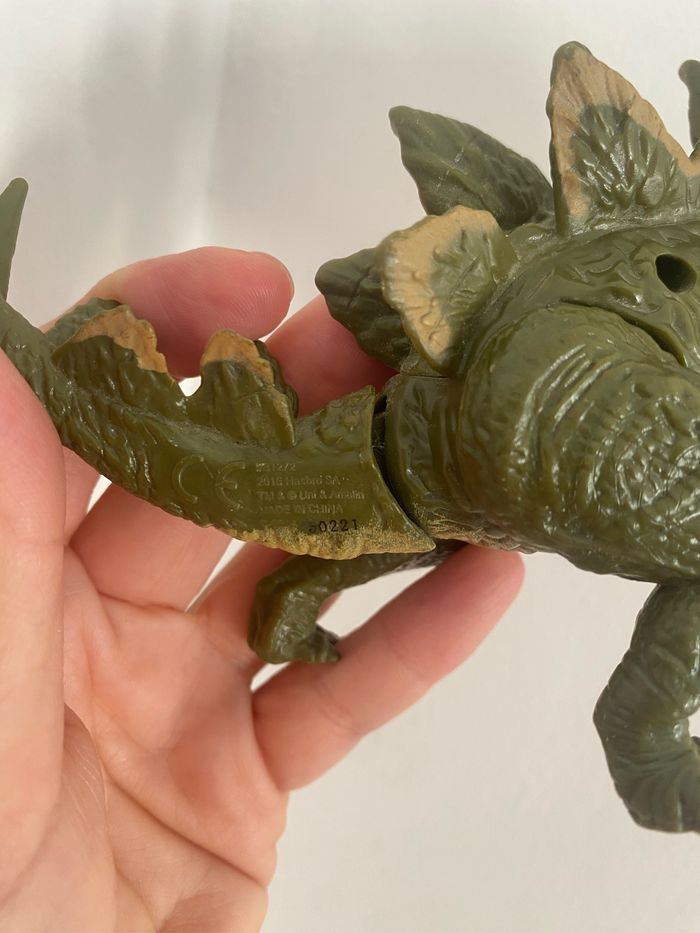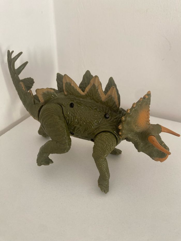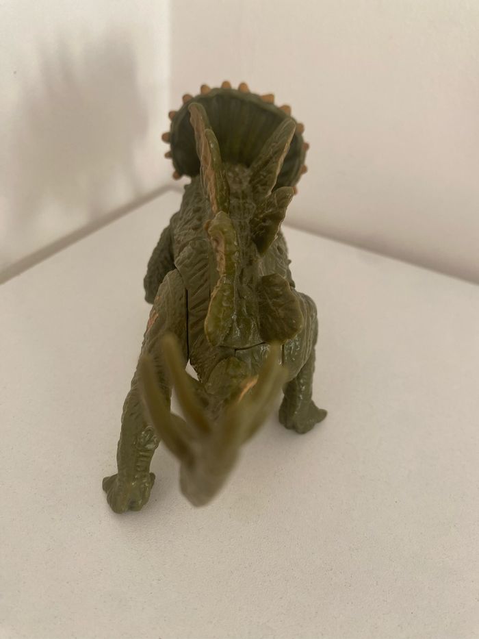 Je vends une figurine dinosaure Stégocératops de Jurassic World Environ 18 cm de long et 10 cm de haut. Hasbro 2015. Bon état général La peinture est partie à certains endroits Voir mes photos precises Quand on appuie sur la queue , le coup s’allonge ( voir ma dernière photo )