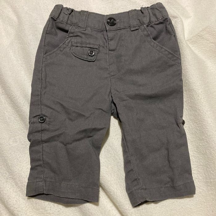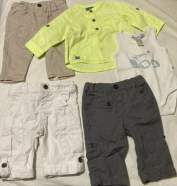 Joli lot constitué de : - Chemise in extenso neuve (sans étiquette) 62cm - pantacourt blanc tape à l’œil (ceinture réglable) 3 mois - pantalon beige clair « mamas & papas) 0-3 mois - body sans manche la redoute - pantalon gris foncé transformable en short kitchoun 3 mois 5€ prix du lot Ou 0,50€ le body 1,50€ chaque pantalon gris ou la chemise 1€ pantacourt blanc. (FlopacaBoite3moiscarree)