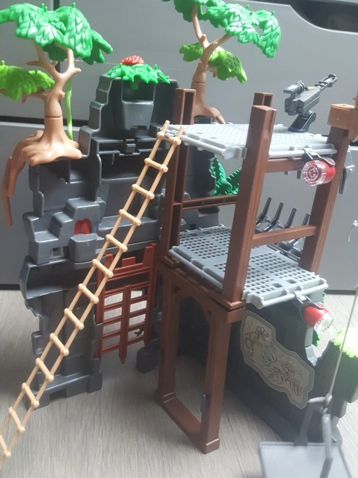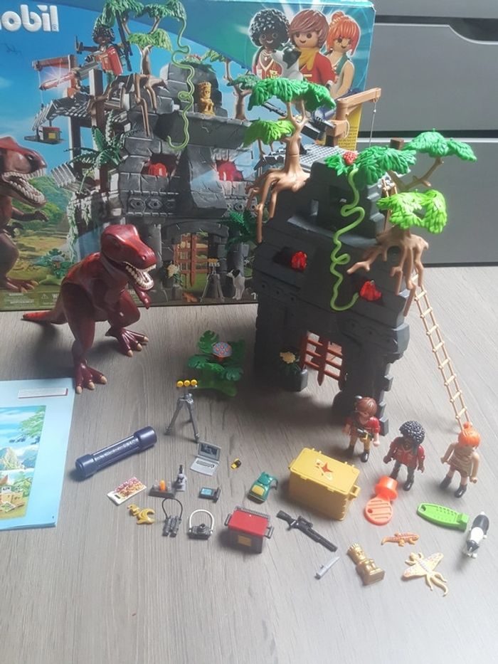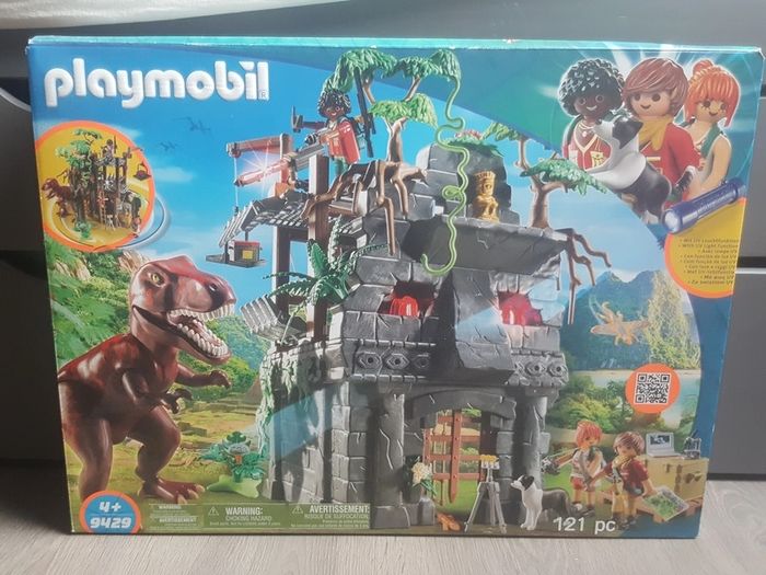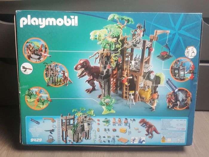 Playmobil 9429. Campement des explorateurs avec Tyrannosaure. 100% complet, avec boite d'origine et notice de montage. Tout fonctionne parfaitement, la lampe UV n'a d'ailleurs jamais été utilisée. Monté une fois et ensuite remis dans la boite. En parfait état, comme neuf !