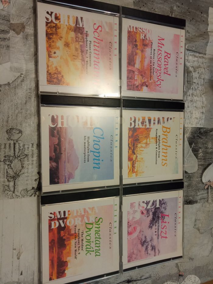 6 CD musique classique 1 Brahms, 1 Ravel Mussorgsky, 1 Liszt, 1 Schumann, 1 Smetana Dvorak, 1 Chopin CD en très bon état (les jaquettes plastiques peuvent parfois être fissurées) Vendus comme sur les photos