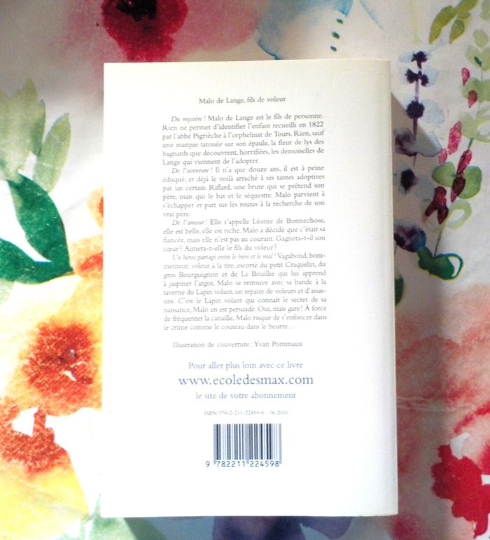 MALO DE LANGE, FILS DE VOLEUR de Marie-Aude MURAIL Ed. Maximax Ecole des Loisirs Bon état - Pages gondolées au milieu (cf photos) Du mystère ! Malo de Lange est le fils de personne. Rien ne permet d’identifier l’enfant recueilli en 1822 par l’abbé Pigrièche à l’orphelinat de Tours. Rien, sauf une marque tatouée sur son épaule, la fleur de lys des bagnards que découvrent, horrifiées, les demoiselles de Lange qui viennent de l’adopter. De l’aventure ! Malo n’a que douze ans, il est à peine éduqué, et déjà le voilà arraché à ses tantes adoptives par un certain Riflard, une brute qui se prétend son père, mais qui le bat et le séquestre. Malo parvient à s’échapper et part sur les routes à la recherche de son vrai père. De l’amour ! Elle s’appelle Léonie de Bonnechose, elle est belle, elle est riche. Malo a décidé que c’était sa fiancée, mais elle n’est pas au courant. Gagnera-t-il son cœur ? Aimera t-elle le fils du voleur ? Un héros partagé entre le bien et le mal !