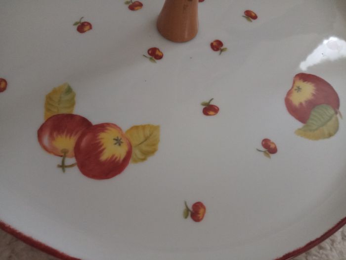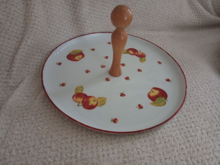 Joli Plateau à Fromage "Maison de la Porcelaine" Diamètre: 30cm Matière: Plateau en Porcelaine et poignée en Bois Forme: Ronde Aux jolis motifs de Pommes En parfait état, vendu comme sur les photos