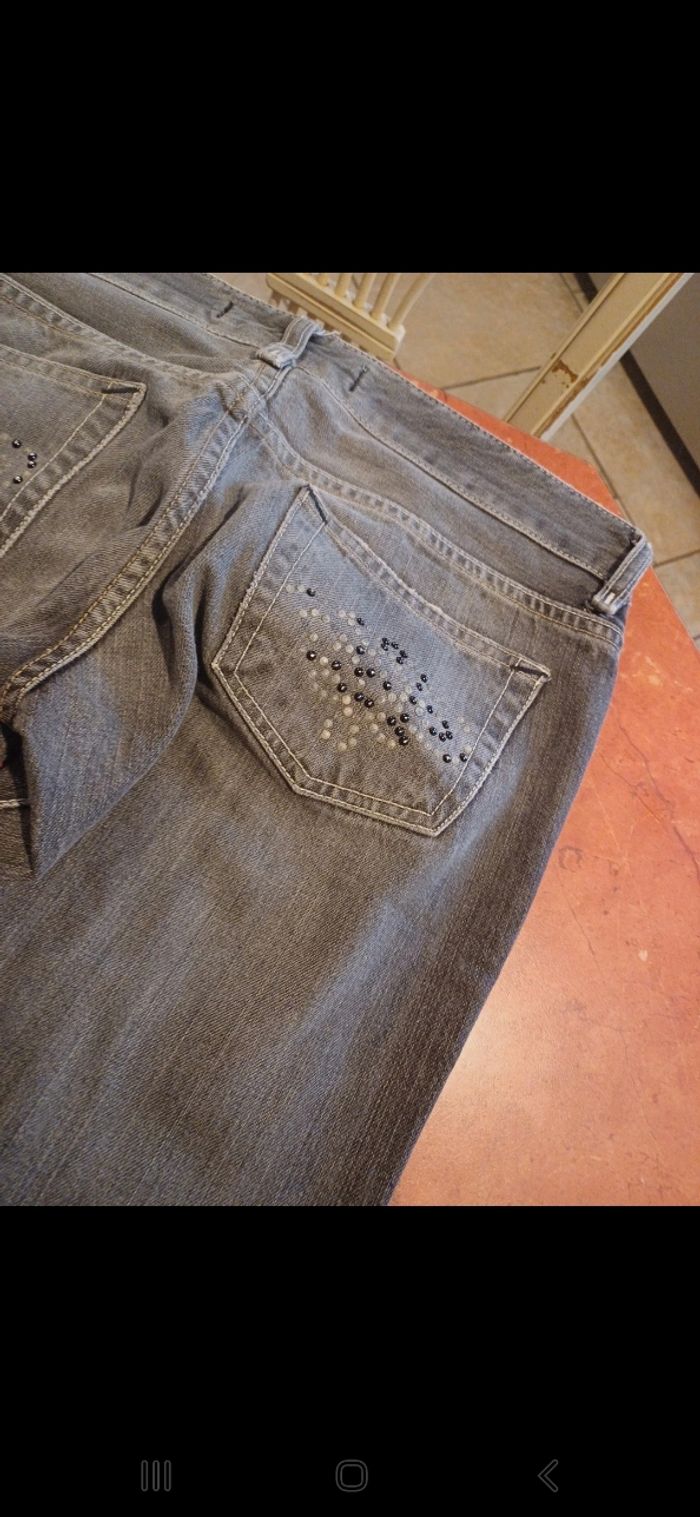 Joli jean boocut effet usé à l avant et sur le bas . Quelques strass sur les poches arrières. En parfait état. Neuf