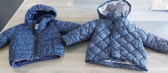 Bonjour, je vends les 2 manteaux mi saison (doudounes) de ma fille de marque Gémo et Okaidi en taille 18 mois. En très bon état, pas de trous ni tâches, les fermetures fonctionnent très bien. Le petit plus sur la doudoune Gémo, la capuche et les poignées un peu resserrées qui empêchent le froid et la pluie de rentrer.