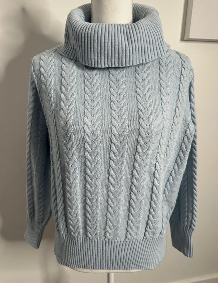 Pull oversize en maille torsades col roulé bleu ciel Vintage T38 M - photo numéro 1