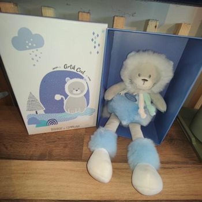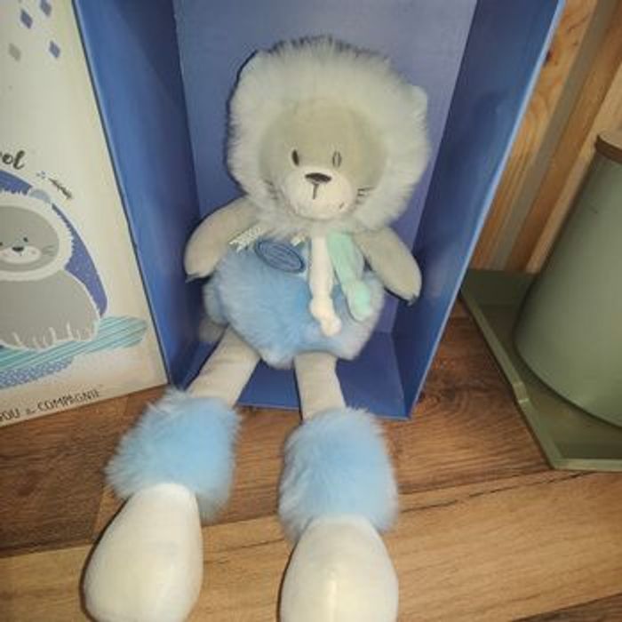 Superbe lion blanc et bleu Doudou et Compagnie - Artik Cool Doudou et Compagnie Collection : Artik Cool Pantin peluche lion Taille : 30 cm environ Coloris : Bleu Neuf encore attaché dans sa boîte originale Idéal a offrir ou à s'offrir 25 euros Envoi rapide et soigné en relais