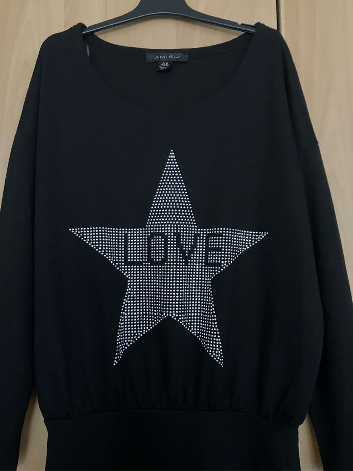 Robe ML noire Amisu Taille 36, avec « strass » en relief sur le devant ~ Achetée neuve, qlqes légères bouloches, en bon état ++ / Étiquette coupée mais il y a de l’elasthanne ~ Longueur totale d’environ 92 cm / Largeur niveau aisselles d’environ 57 cm / Largeur taille de 36 cm ~ Vendue 3€50 ~ Envoi soigné.