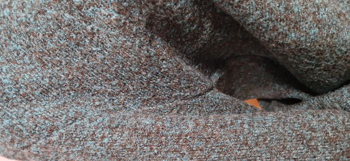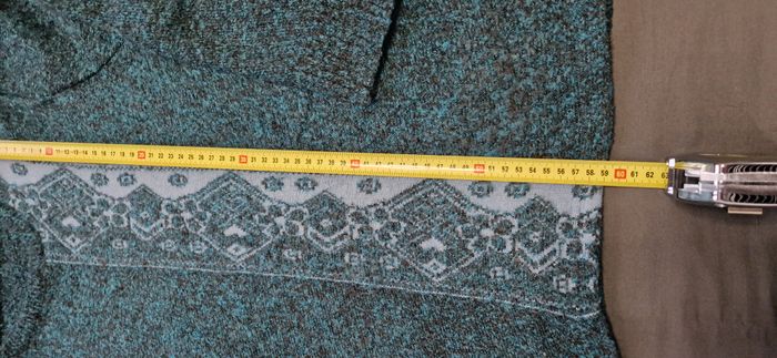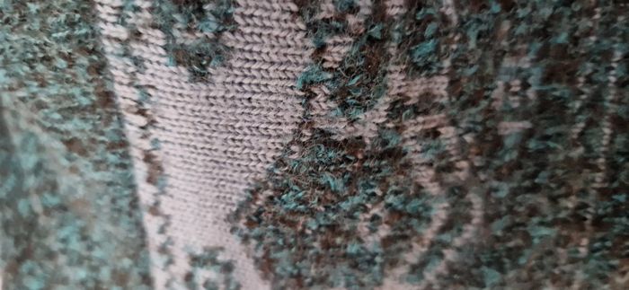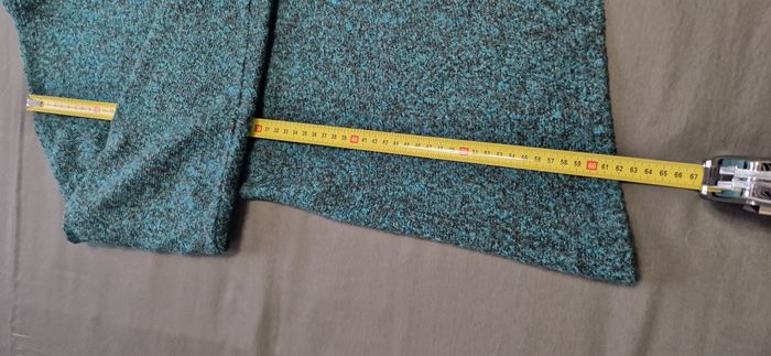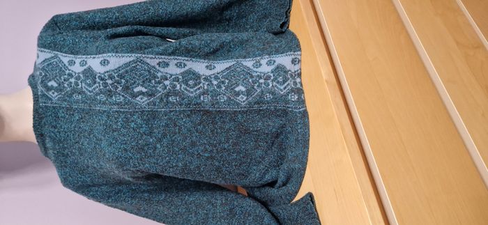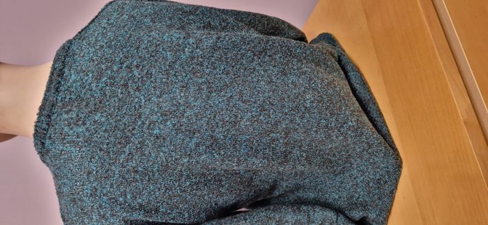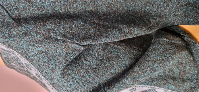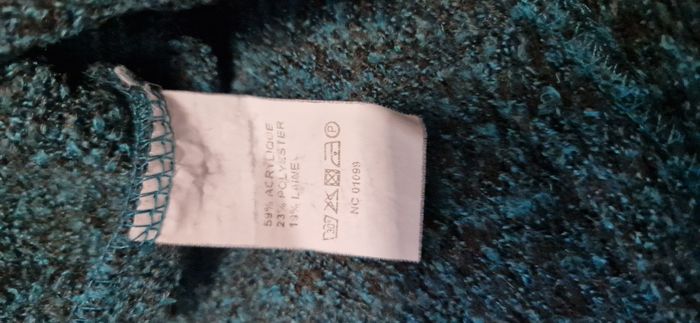 Pull de qualité (marque oubliée) asymétrique coloris canard chiné avec décor à l'avant gauche T. XL (voir mensurations sur les photos) TB à excellent état (pas de trace d'usure particulière si ce n'est l'étiquette de composition en raison des nombreux lavages)