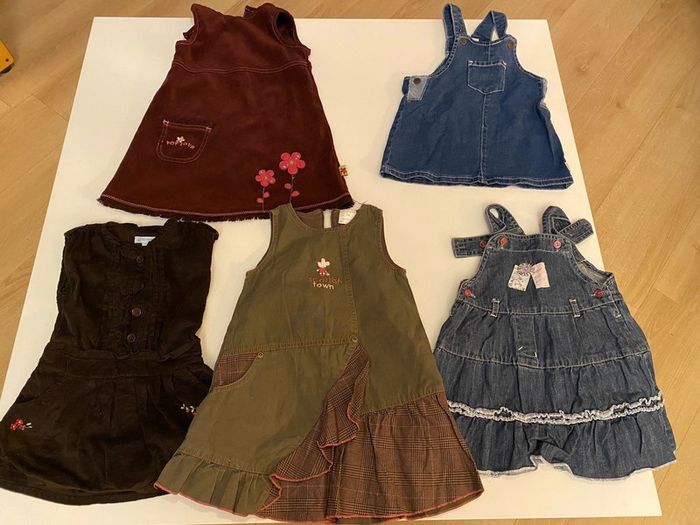 Lot 2 pantalons 18 mois. Le pantalon bleu fonce a été recousu au niveau de l’entrejambe (photo 3). La couture tient très bien. Le pantalon vert est en très bon état. Marques : obaibi, toutcomptefait Lot 5 robes 18 mois mi-saison/hiver Marques : tex, u tout petits Lot 5 T-shirt manches longues 18 mois Marques : kimadi, natalys, unbasic, culbuto, kiabi Manteau imperméable automne 18 mois Pas de marques ni traces, Marques : kimbaloo