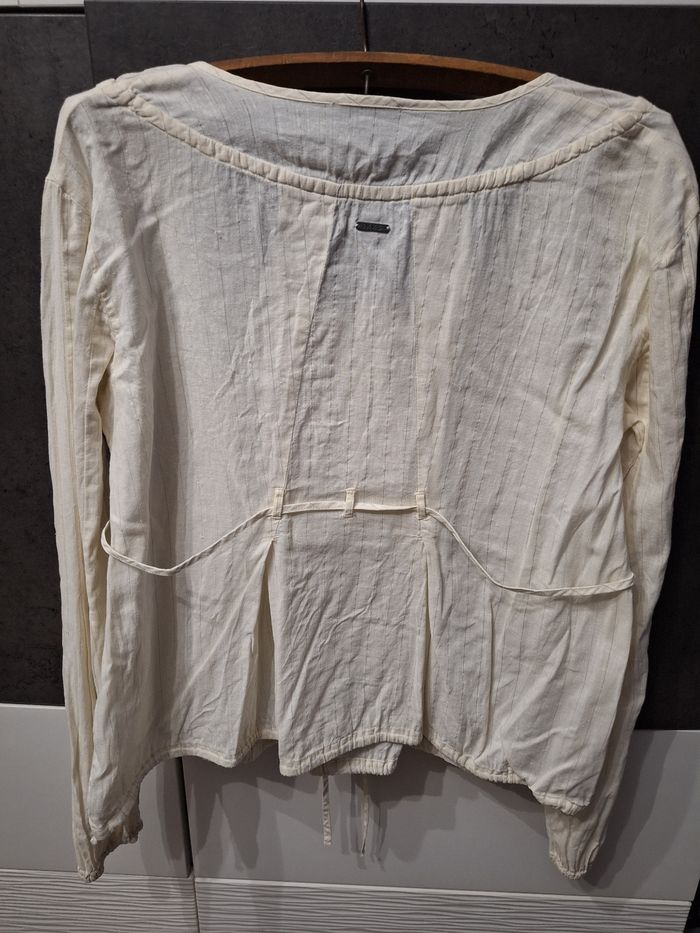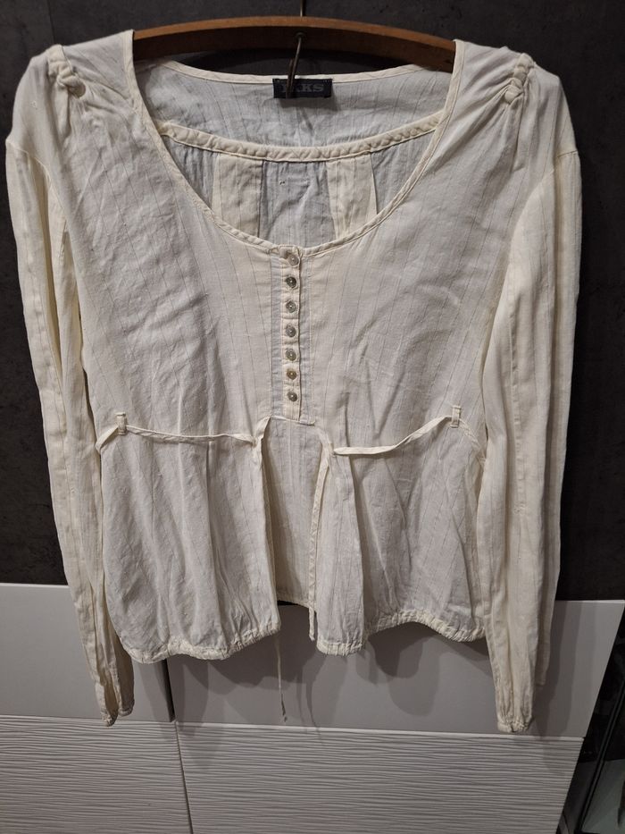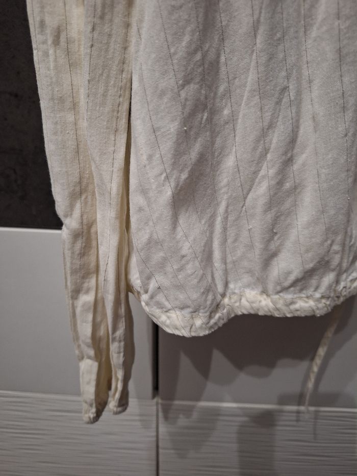 Jolie blouse manches longues légère écru avec fines rayures métalliques, boutonnée devant, ceinture, liens de serrage au bas, poignets froncés, marque Ikks, taille 38, mélange lin, peu portée en très bon état