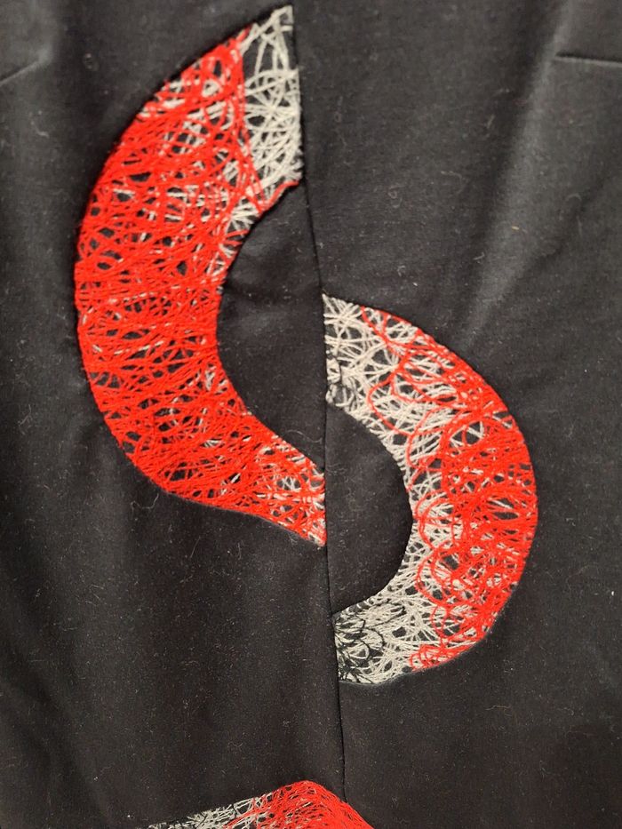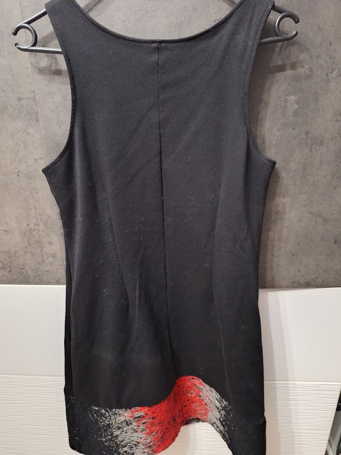 Jolie robe débardeur noire avec formes graphiques devant et bas de la robe avec motifs fils tissés rouge/noir/gris, taille 38, peu portée en très bon état