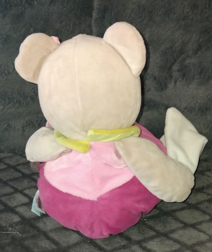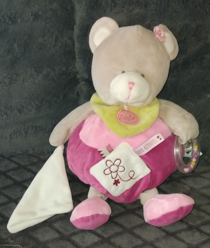 Grand doudou peluche ours en velours de couleurs rose 2 tons Col autour de son cou en velours de couleur vert Attaché à sa main un mouchoir en velours de couleur blanc et dans l autre main un anneau en plastique abev billes colorées Ventre avec bruit de papiers froises Fleur brodée sur le doudou Peluche ours qui mesure 40 cm