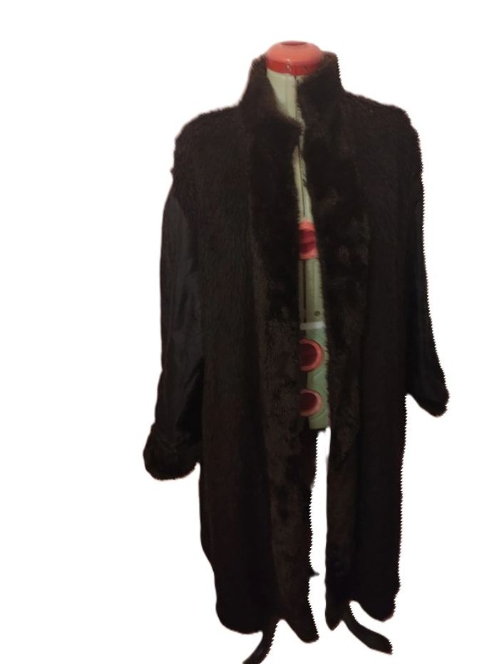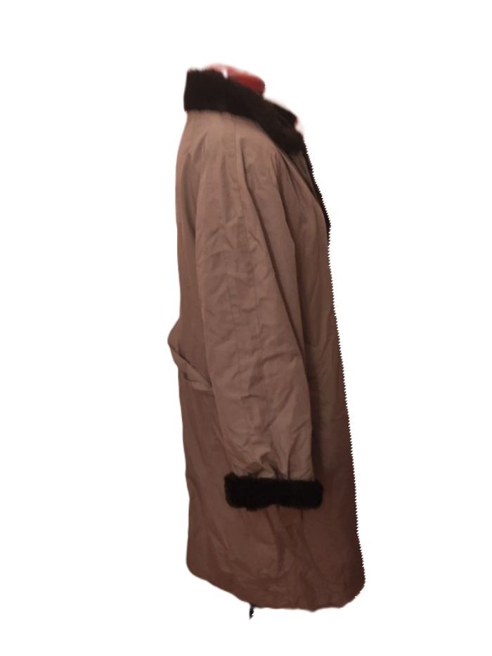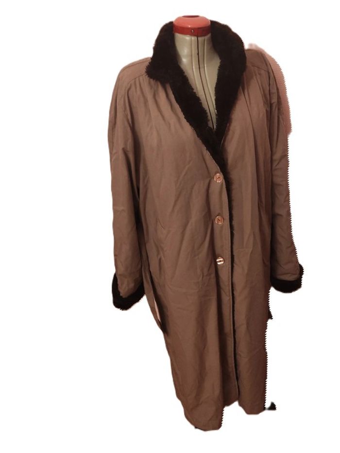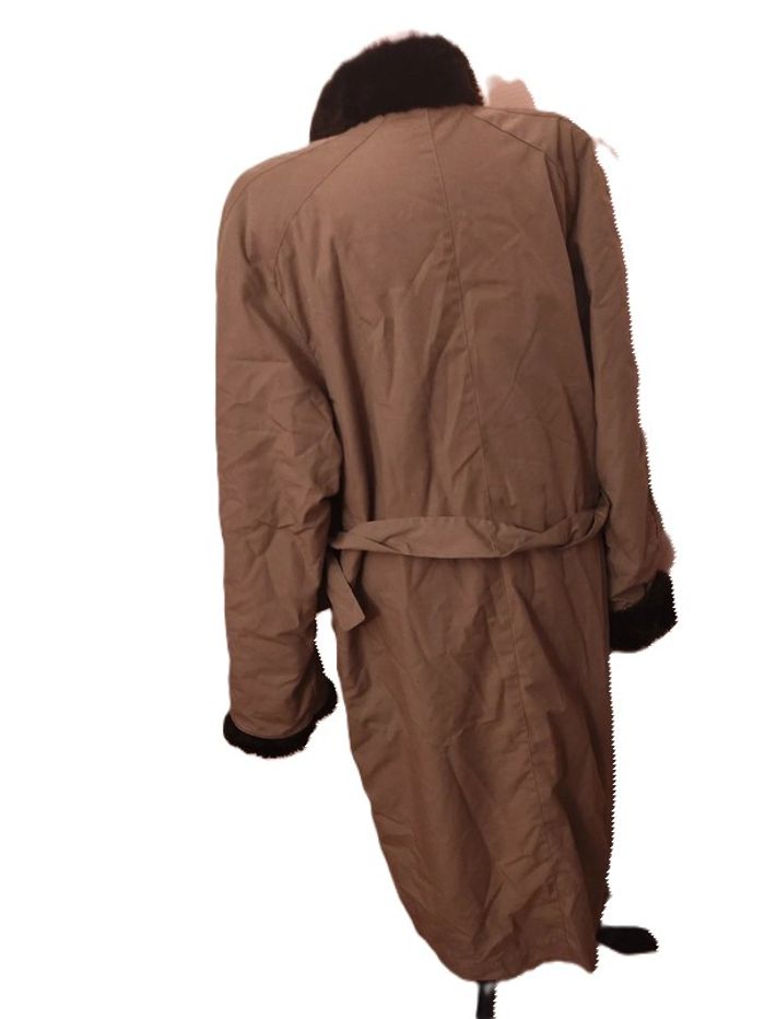 <<<<Regardez bien les mensurations, pas de taille visible.Merci>>> Trench beige avec Fausse fourrure noire. Vintage . Longueur totale : 120 cm. D'une aisselle à l'autre : 63 cm. 2 poches à l'italienne. Ceinture.