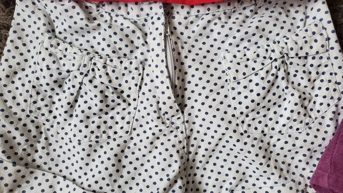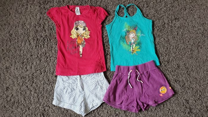 Lot de 2 ensembles fille 6-7 ans composé de 1 tee-shirt avec short blanc à pois bleus et un haut à bretelles avec short matière éponge. Les 2 hauts sont quasiment neufs.