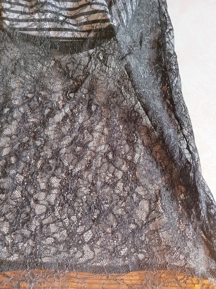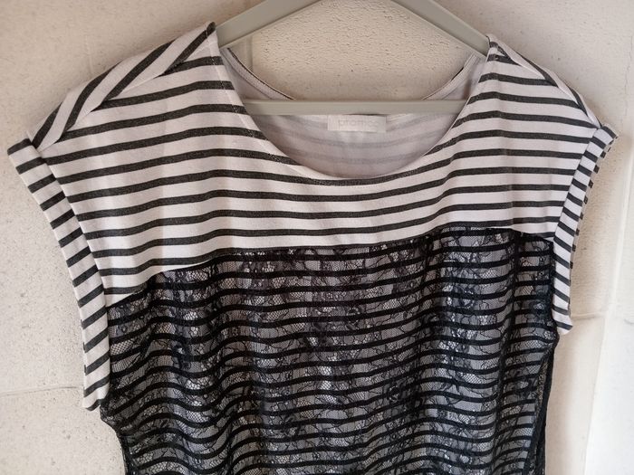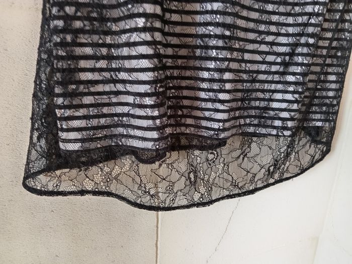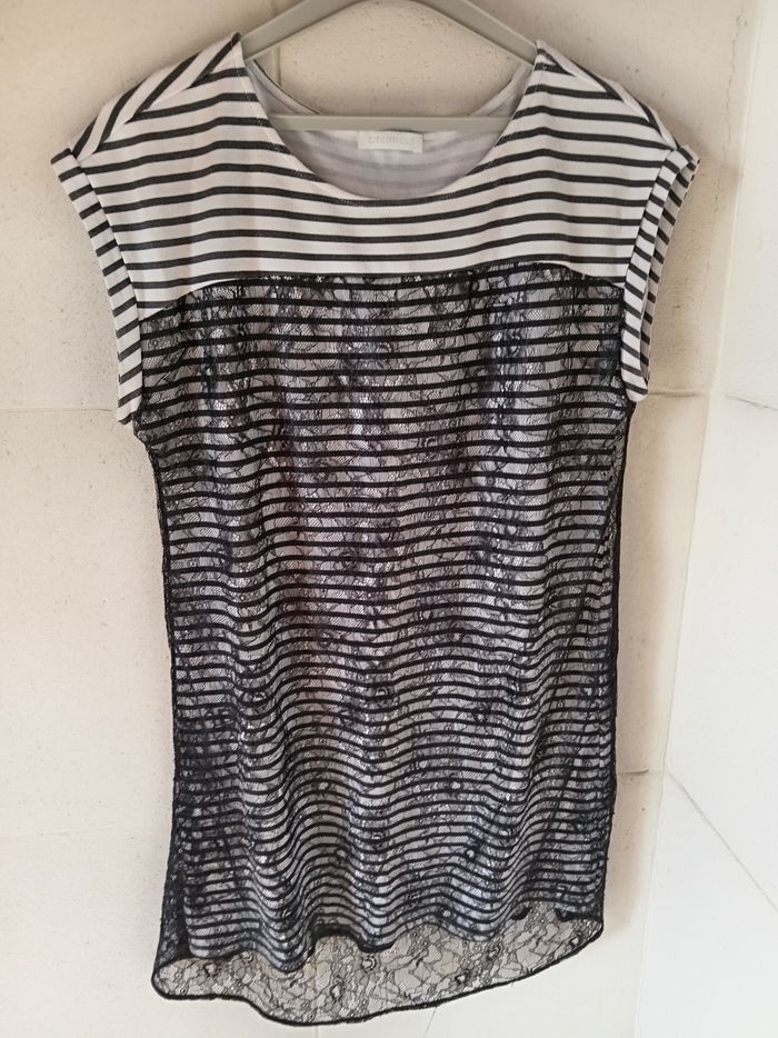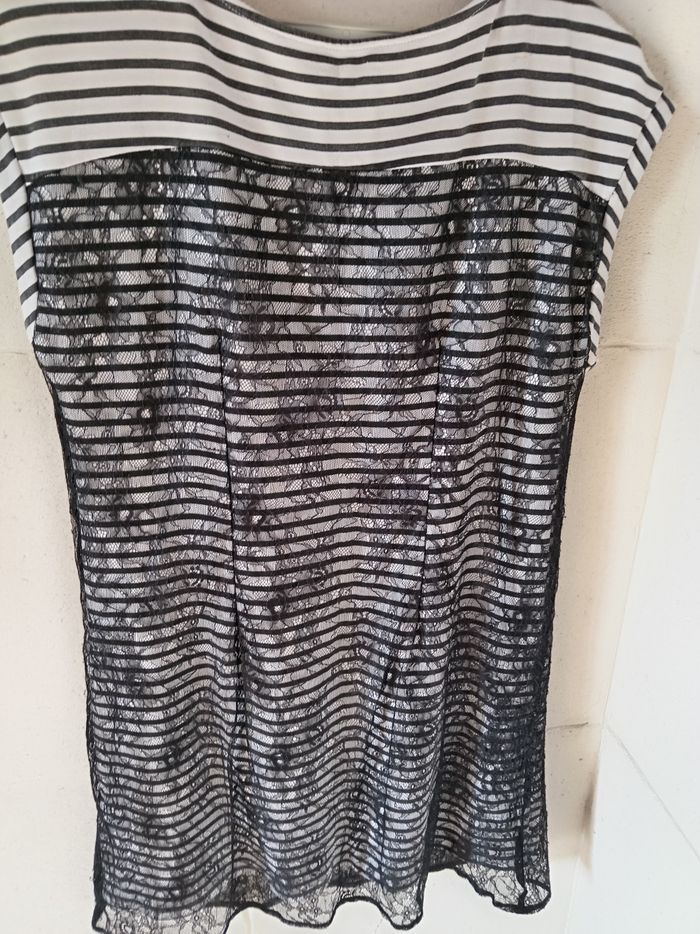 Coton épais rayé dessous, dentelle noire dessus Cintrée derrière Longueur 84cm Largeur aisselles 48cm Manque étiquette taille et composition