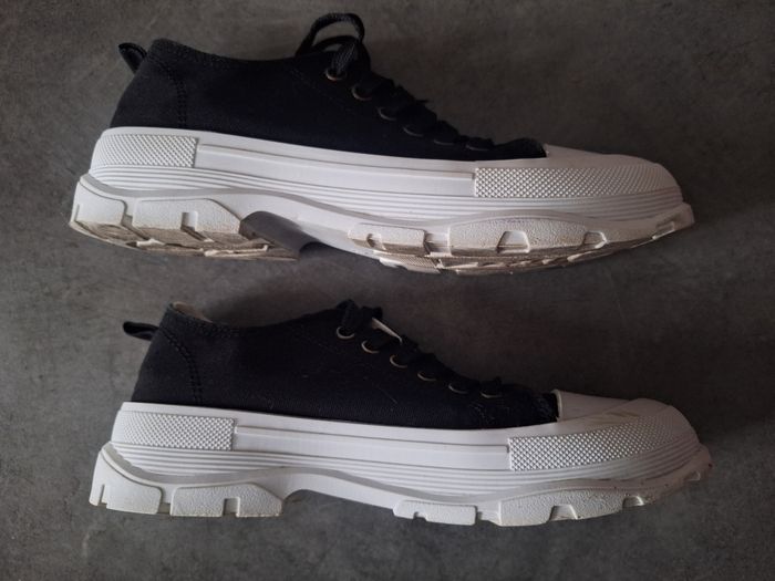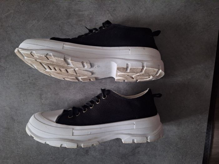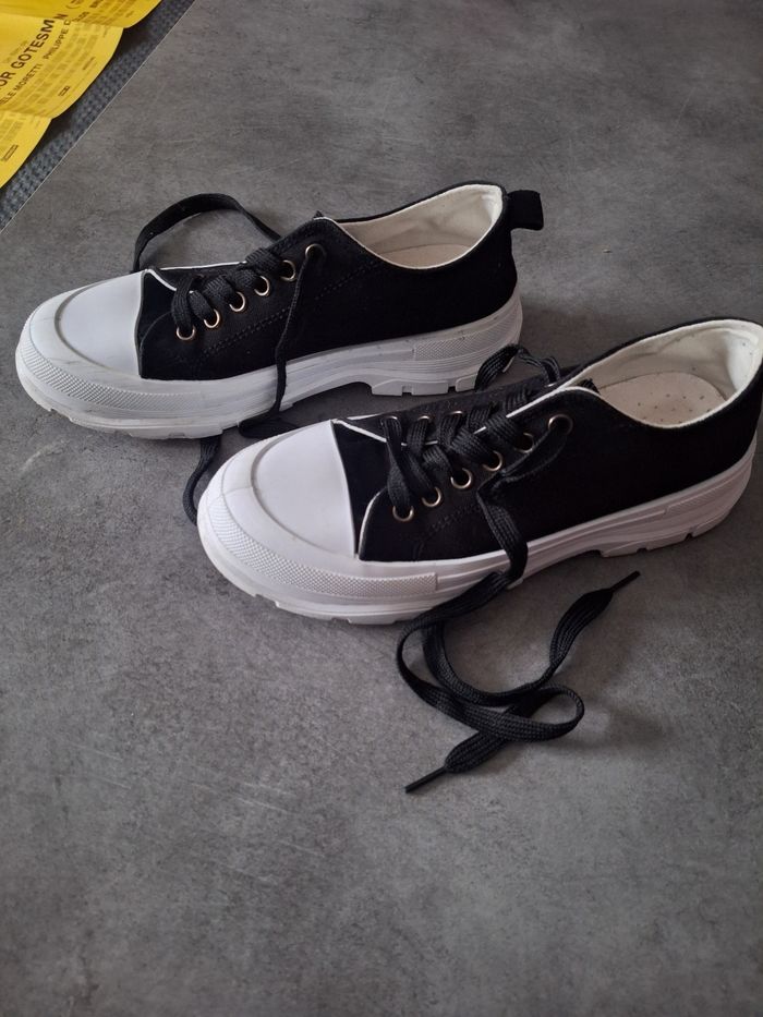 Jolies chaussures en toile noire, semelles un peu crantées blanche, style Palladium, pointure 38, peu portées en très bon état