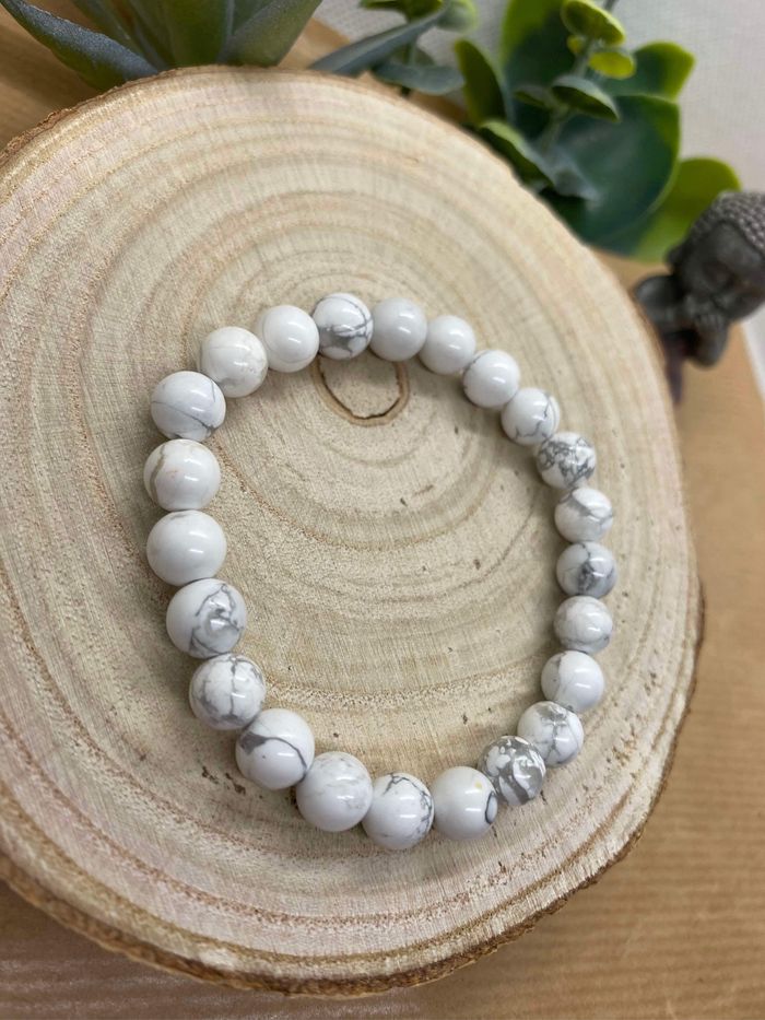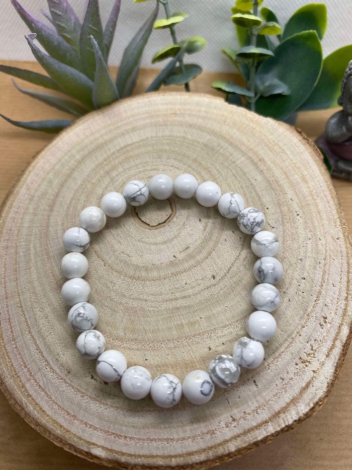 Très joli bracelet de lithothérapie en pierres naturelles de howlite blanche Taille 18cm , perles de 8 mm Howlite La pierre blanche howlite aurait des propriétés extrêmement stabilisantes, elle permettrait d'établir une cohérence dans les sentiments, et aurait comme effet d'améliorer le sens des responsabilités et de dissiper les craintes. Elle favoriserait alors le discernement dans des situations du quotidien. Les vertus de la howlite permetttraient de prendre de bonnes décisions, en toute sérénité en écartant toutes pensées superflues et négatives. Elle permettrait d'avoir les idées plus claires lors des choix importants, et de se diriger vers la réussite et le bonheur. Elle lutterait contre le stress engendré par un travail trop envahissant, une situation familiale, ou certains problèmes du quotidien. De ce fait elle protègerait du burn out en apportant la paix et la sérénité. Elle améliore la digestion et diminue les dysfonctionnements de l’estomac. Vous pouvez l’utiliser lors de vos détox après des weekends d’excès. 85