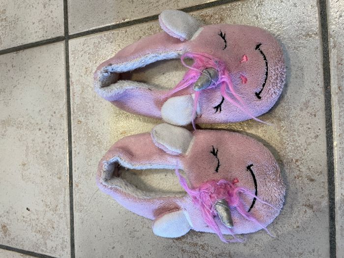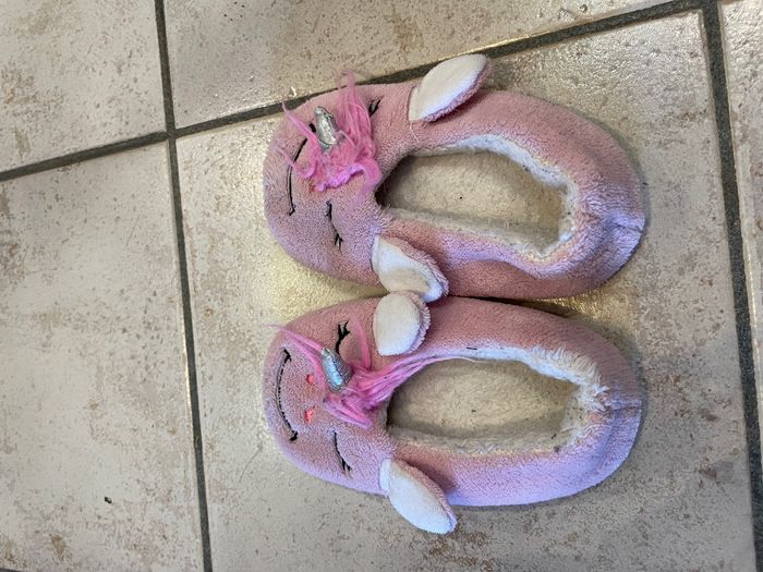 Chaussons licornes en taille 27/28 Portés (la polaire à l'intérieur est un peu tassée)mais restent en bon état, la semelle en dessous est très peu usée (voir la photo) Je suis entrain de les laver pour la vente (les photos ont été prises avant le passage en machine)