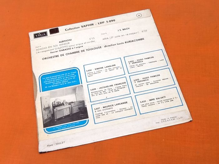 Vinyle 45 tours Albinoni / Bach (1968) Vega Collection Saphir LDP 5090