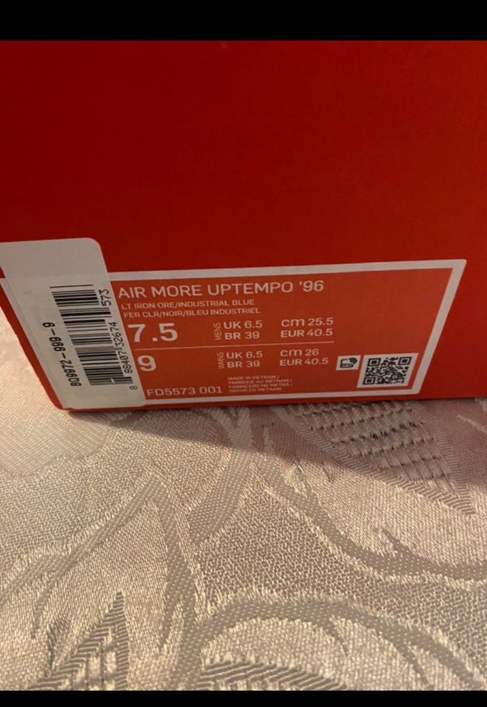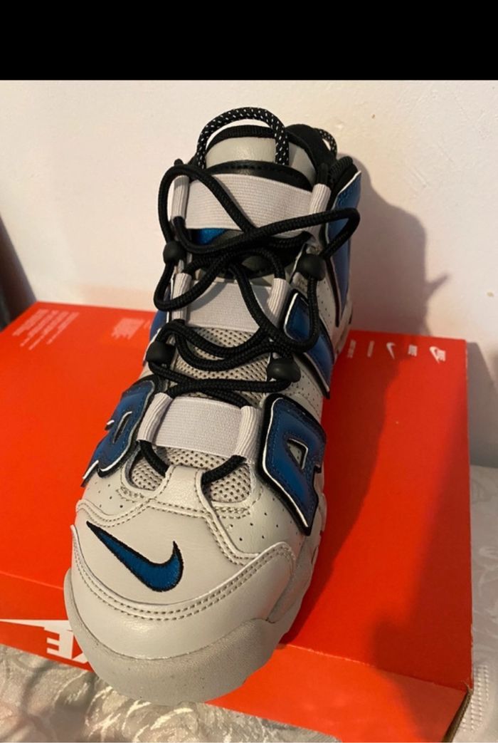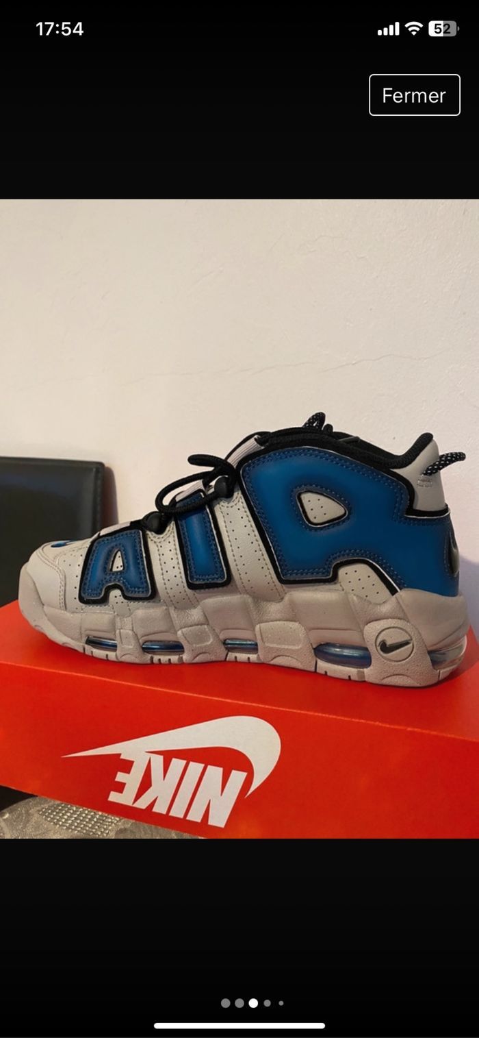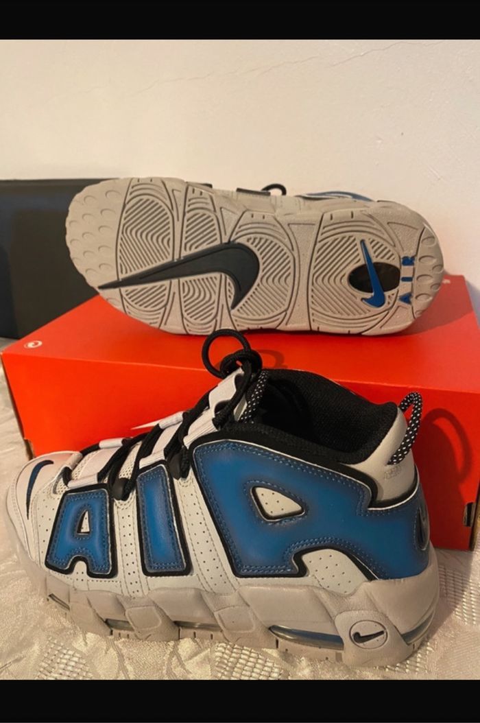 Nike Air More Uptempo ’96, modèle iconique avec le logo AIR sur les côtés. Idéales pour le streetwear ou les collectionneurs. 🏷️Marque : Nike 👟Modèle limité : Air More Uptempo ’96 📐 Pointure : 40.5 🔖État : Neuf avec boîte mais pas le couvercle 🎨Couleur : gris / Bleu ✅ Confortables, stylées et rares