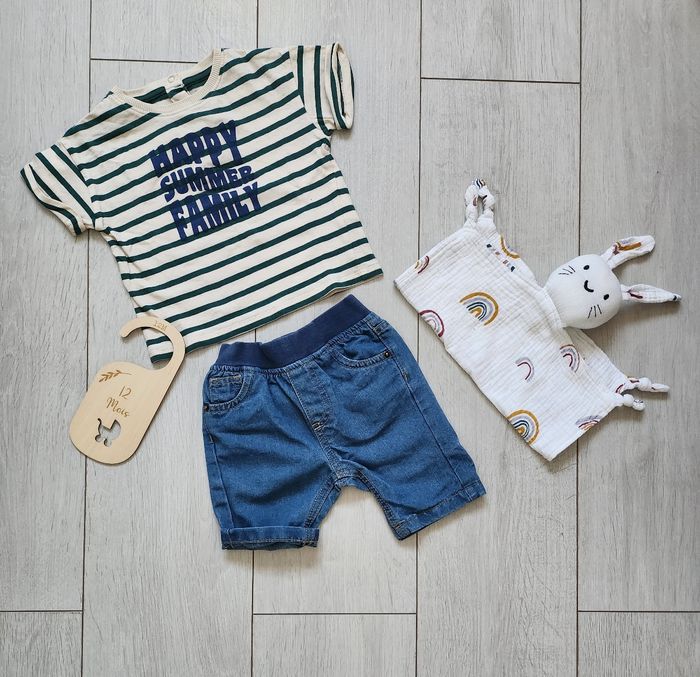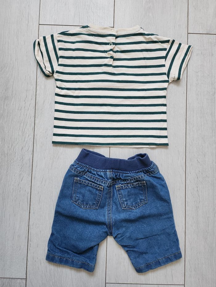 Très bel ensemble : - 1 T-shirt rayé Vertbaudet neuf ! - 1 Short marine Boîte à Malice. En très bon état. Taille 12 mois.