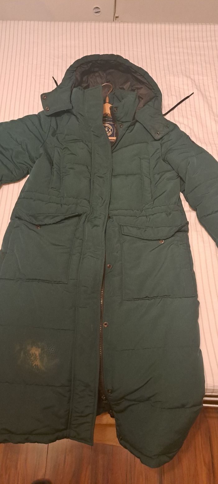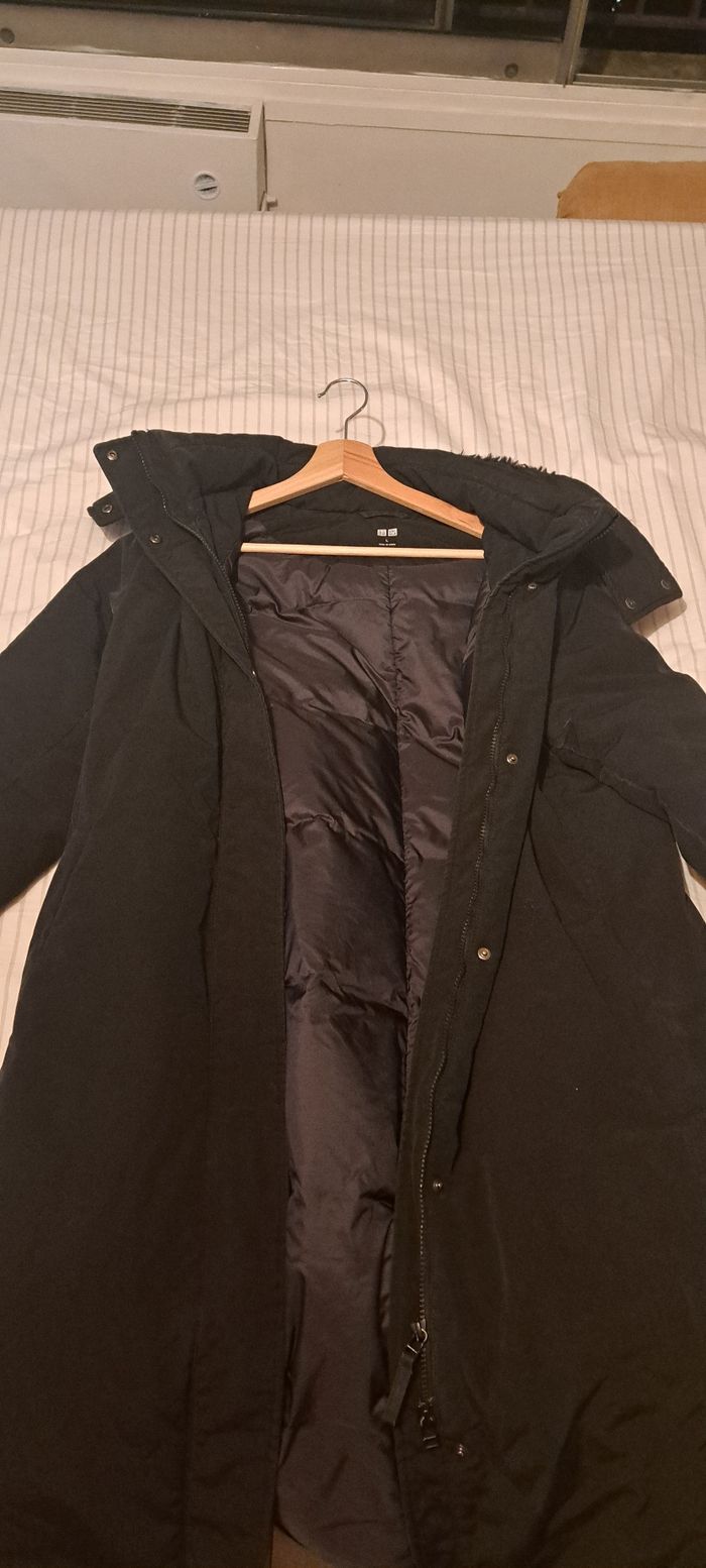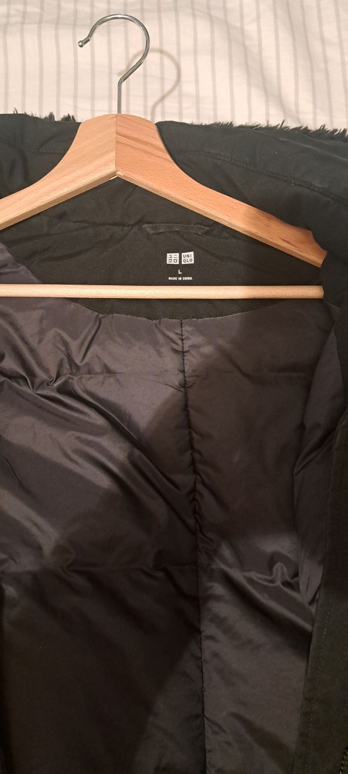 2 doudounes à vendre dont 1 verte foncée de chez superdry (défaut en bas) et 1 noire de chez uniqlo en taille L pour les deux Possibilité d enlever les capuches