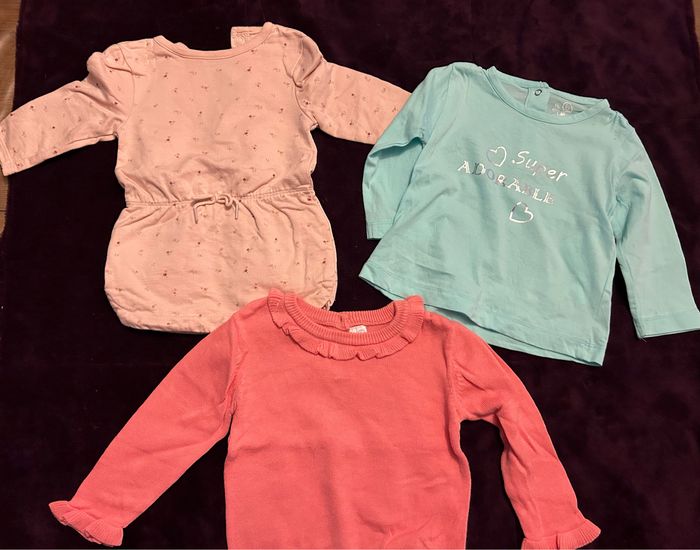 1 t shirt (le bleu) neuf sans étiquette 1 pull ( le rose) neuf sans étiquette 1 robe kiabi Taille 6 mois