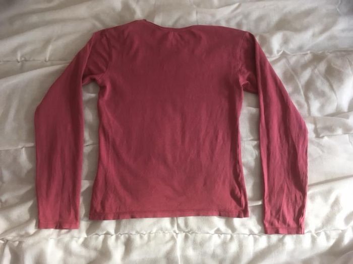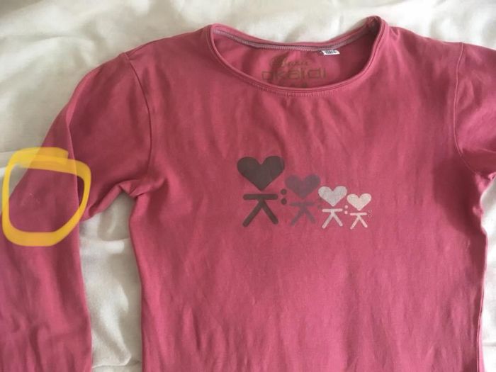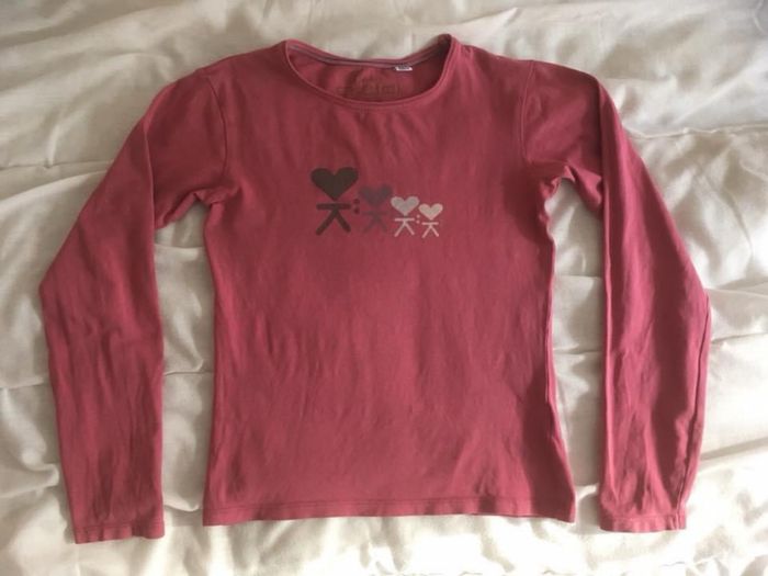 Haut ML Okaïdi, noté 10 ans (138 cm) mais taille plutôt 8/9 ans niveau longueur, vendu 2€ car léger trait de stylo doré sur une manche. Coloris un peu + clair en réel.