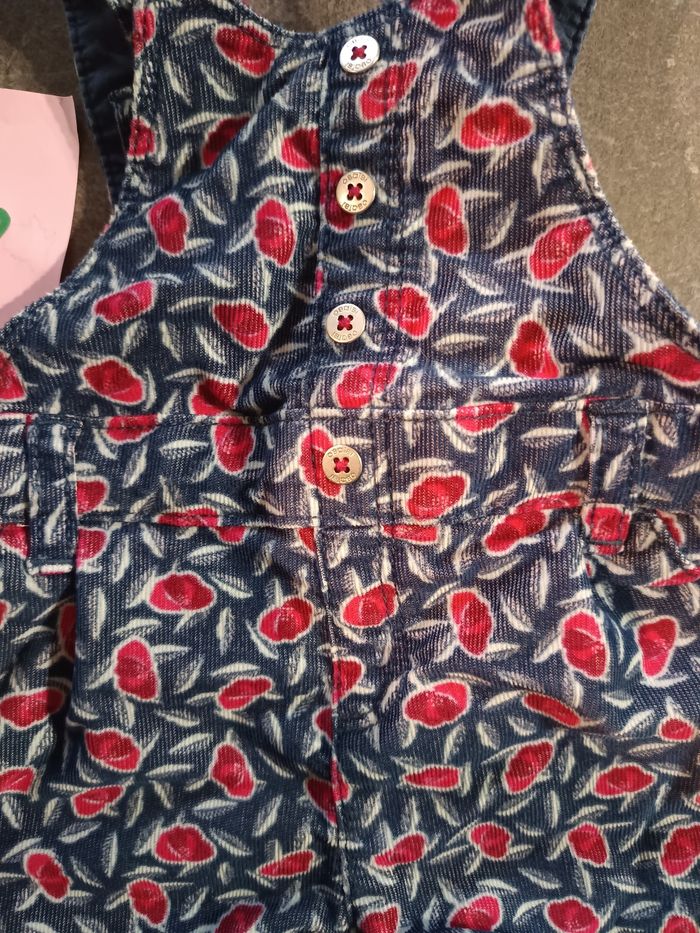 Salopette short couleur bleue, motifs fleurs rouge, EXCELLENT état, porté que 2 fois ! Taille 3 mois
