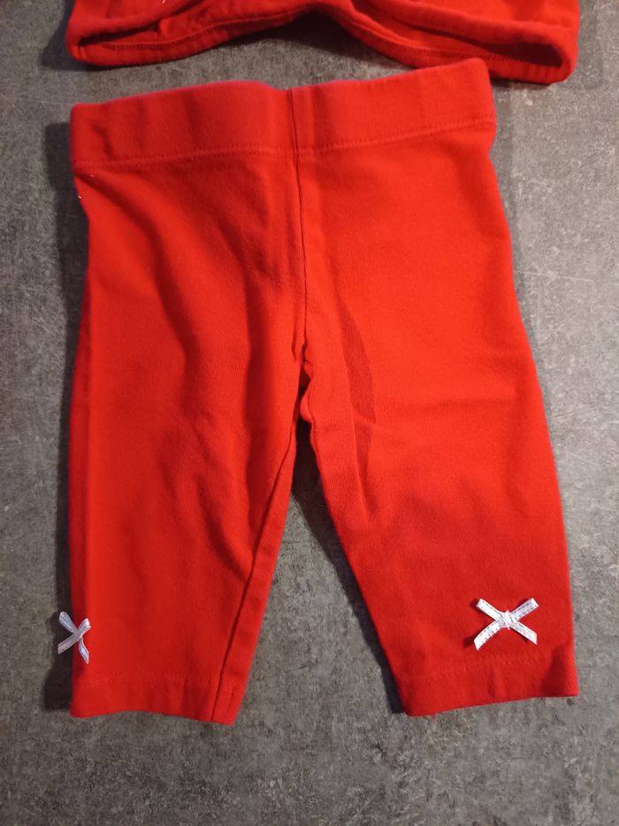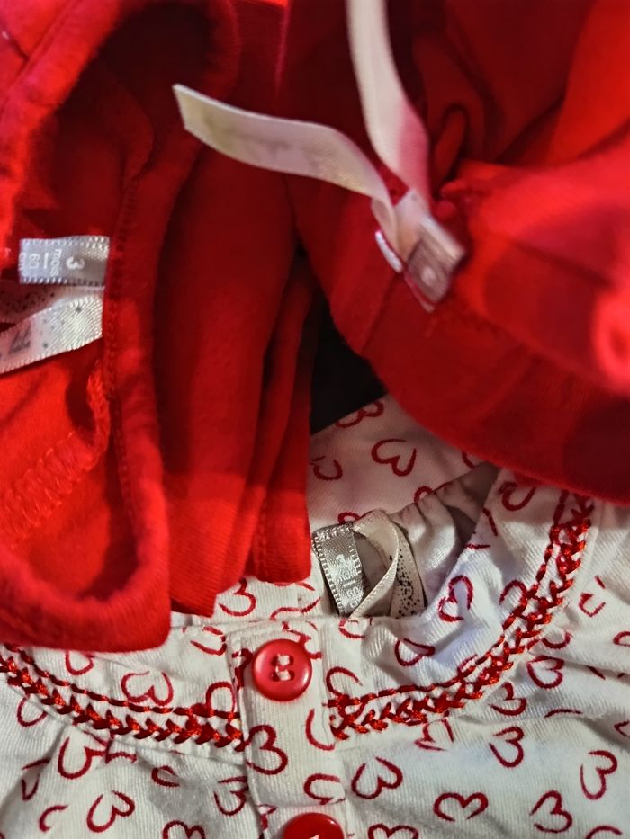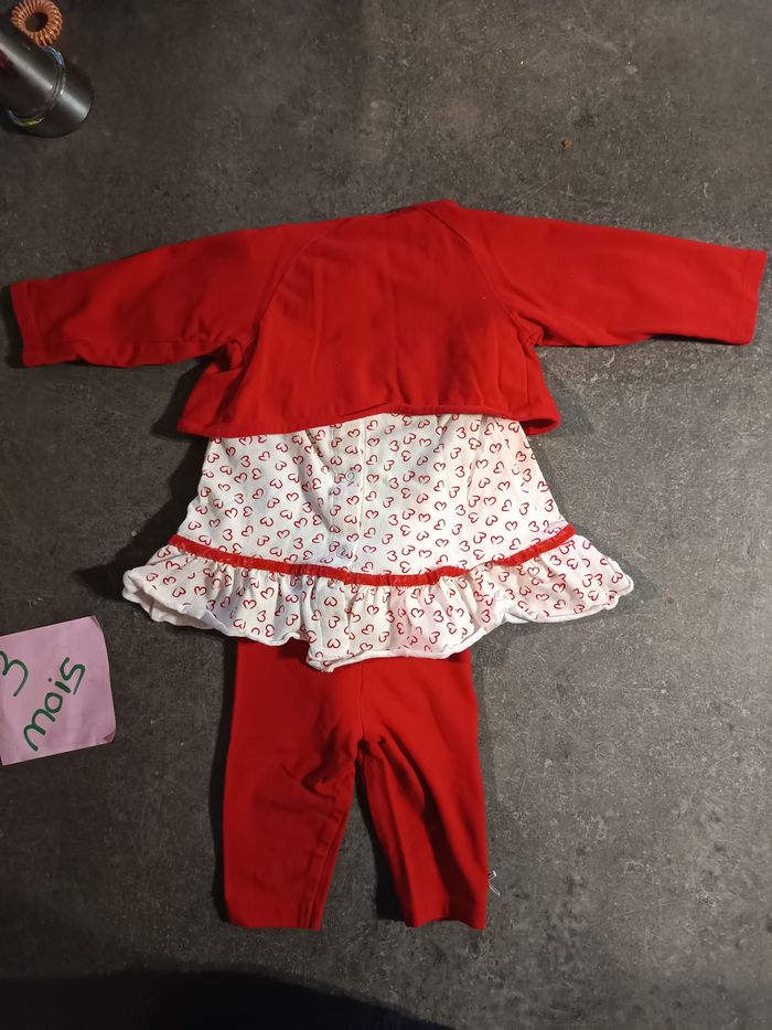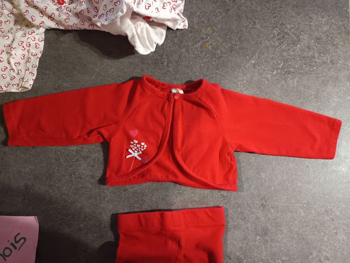 Ensembles 3 pièces : - 1 petit gilet rouge - 1 legging rouge avec petit noeud - 1 tunique blanche avec coeurs rouge, Très bon état, peu porté ! Taille 3 mois