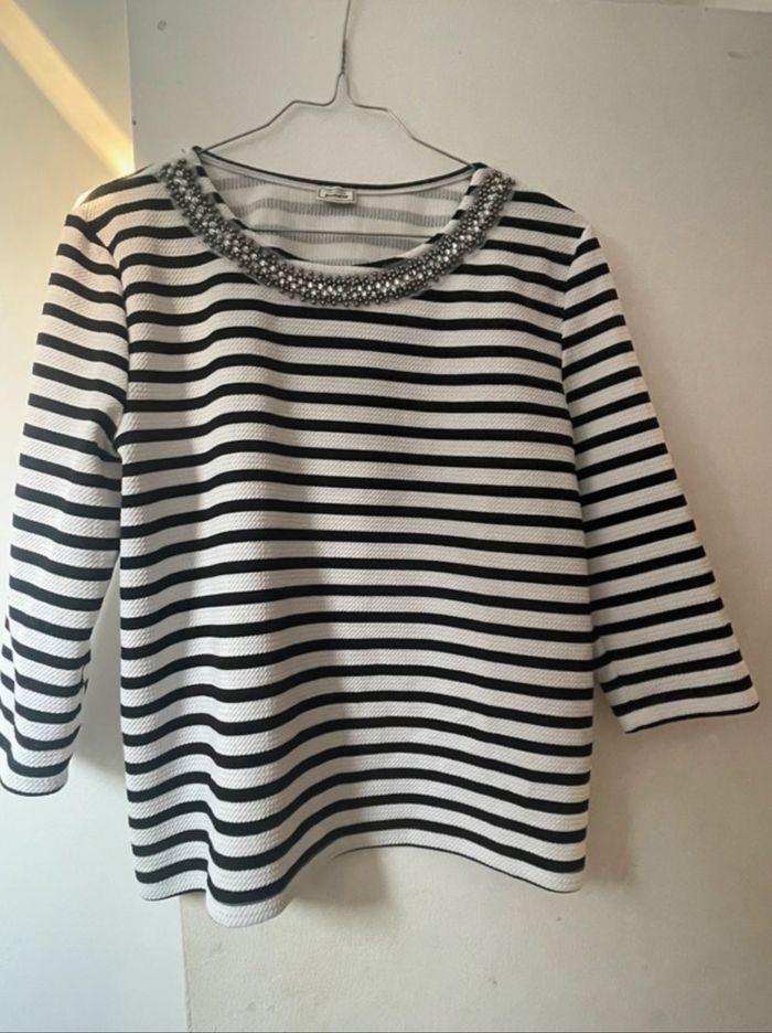 Marinière noire et blanche. Très jolis détails en perles au niveau du col. Manche 3/4 Beaucoup porté mais reste en très bon état . Très bonne qualité du produit malgré les multiples lavages toutes les perles sont encore présentes.