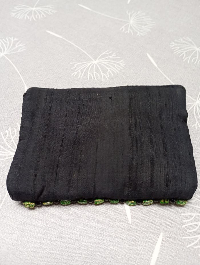 Petite pochette noire avec perles. Dimensions : 12 x 9 cm. Bon état.
