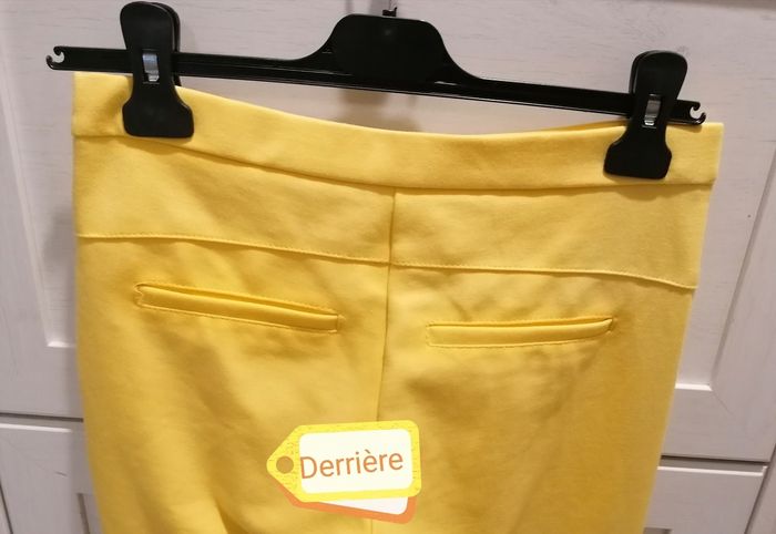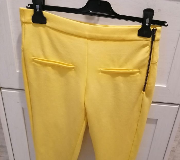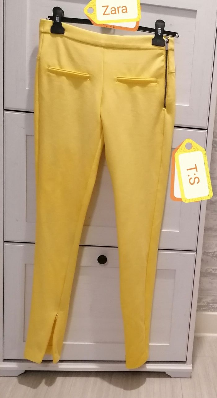 Pantalon fille , Zara Taille :S. Jaune 2 fausse poches devant, 2 fausse poches derrière. Fermeture zippée côté gauche. 2 Fermeture zippée niveau pieds. 60%viscose. 35%polyamide. 5%elasthane. Porté 2fois. 10€