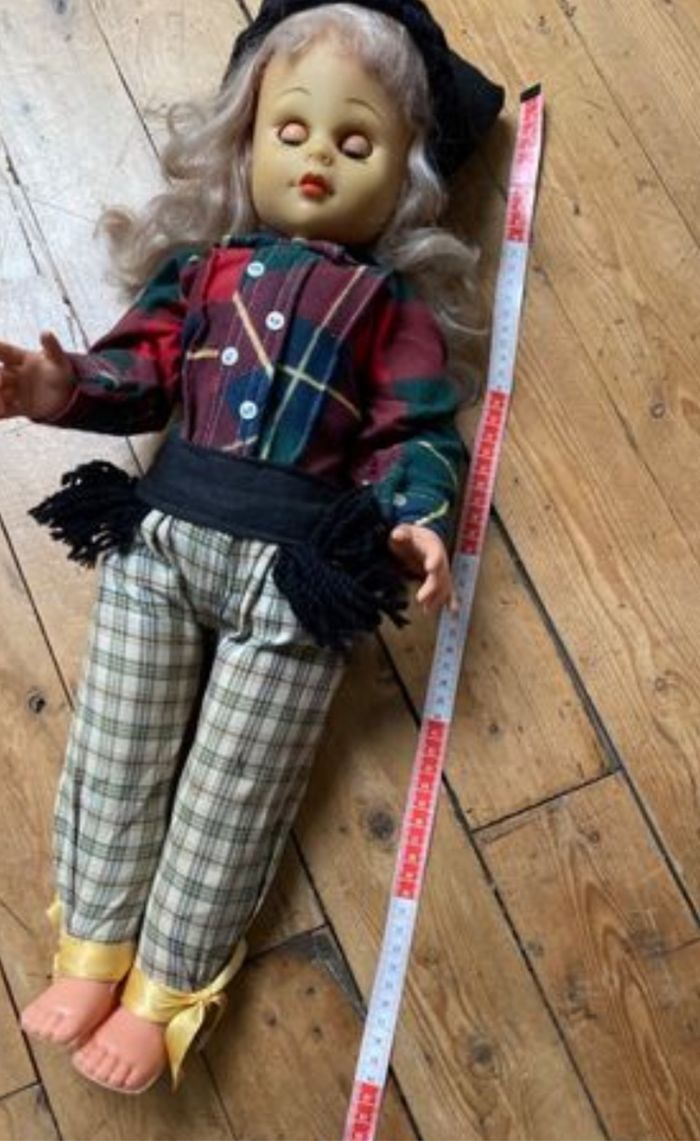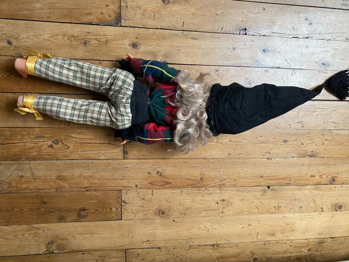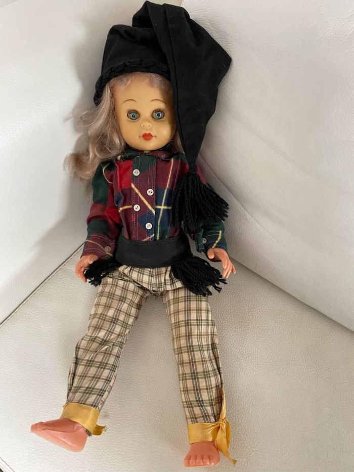 Grande poupée Ancienne 60 cm sans compter le chapeau Vêtements ramoneur Chemise écossais tartan rouge et vert Pantalon écossais vert beige Cheveux un peu rose