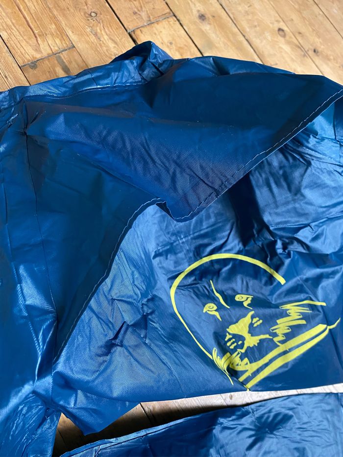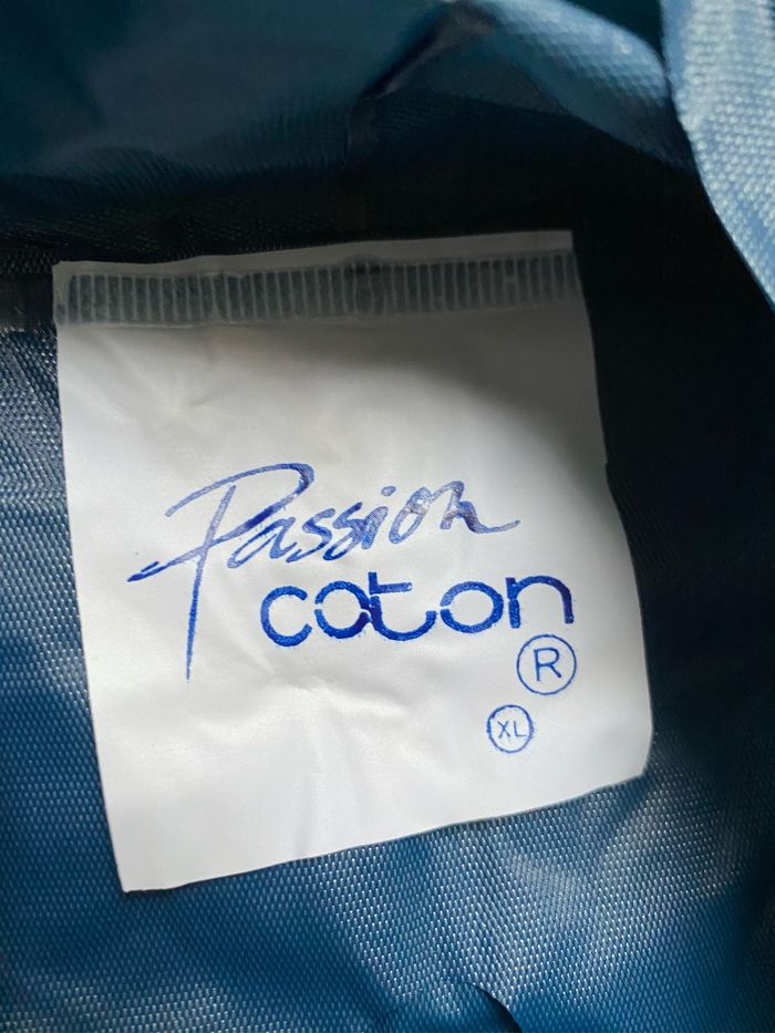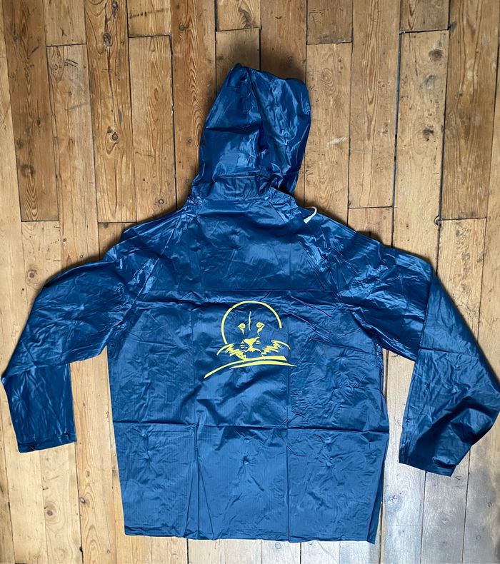 Veste Habit de pluie neuf pvc bleu marine taille XL Lion dans le dos Double fermeture par pression Pression au poignet 2 poches avec rabats Cordon pour serrer la capuche Aération sous les bras et en haut du dos Passion coton Aisselle à aisselle 65 cm Dessous de manche 53,5 cm Pas de carrure, car les manches sont raglan Longueur 80 cm Largeur à plat tout en bas 65 cm