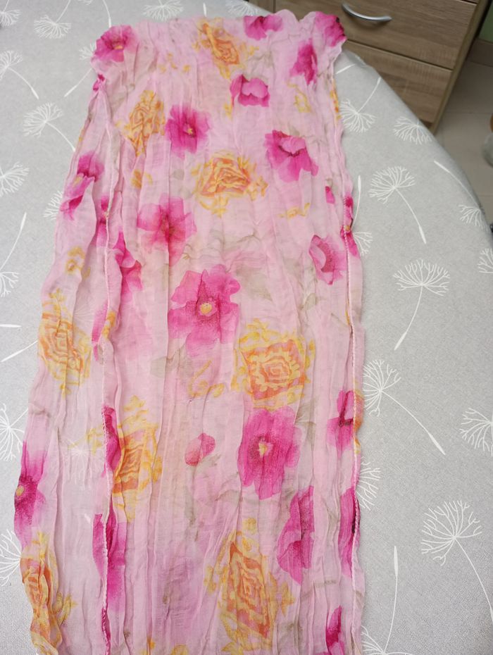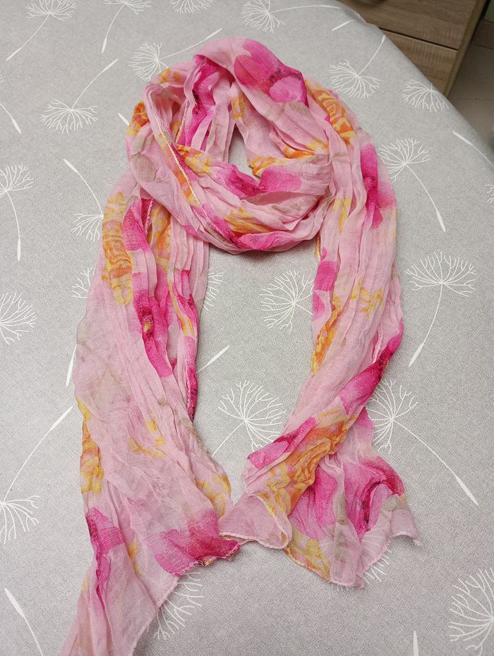 Foulard rose avec fleurs. Dimensions : 158 x 46 cm. Très bon état.