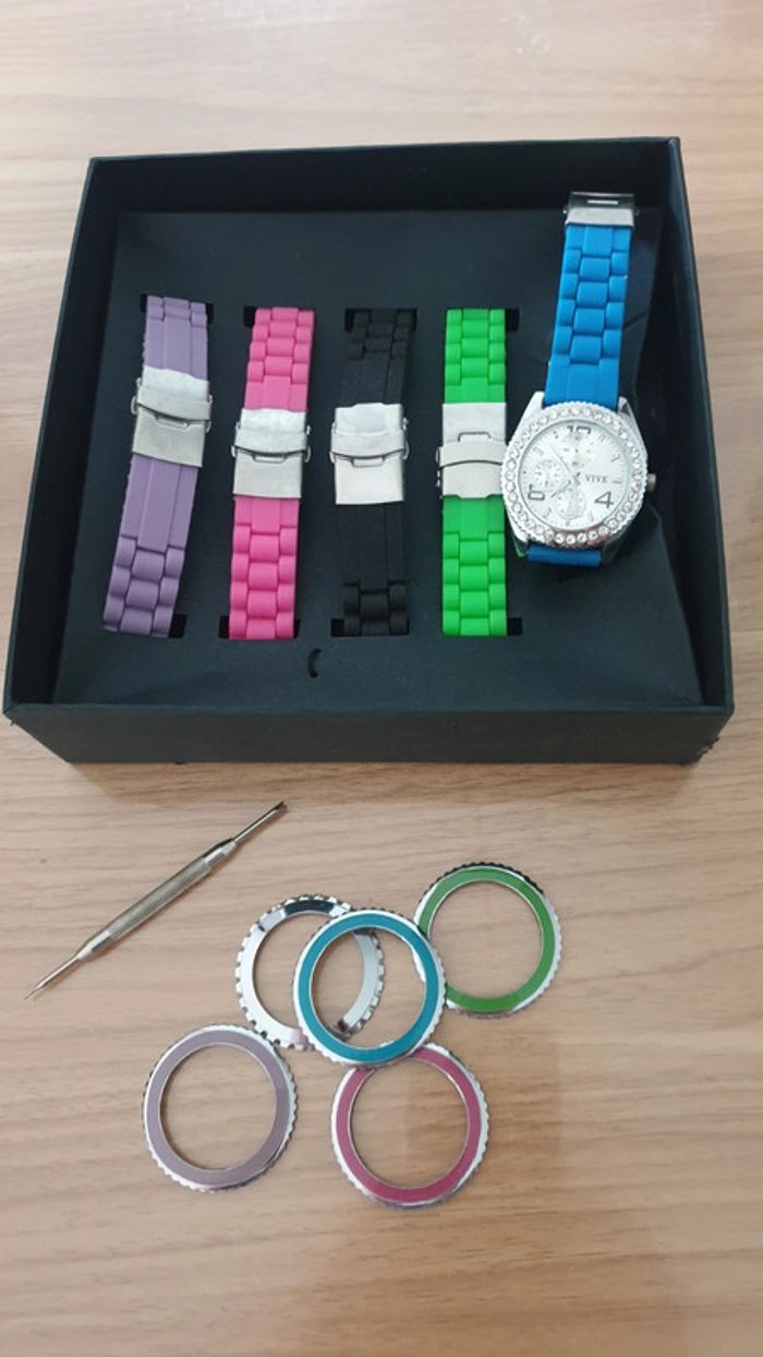 Montre avec ses bracelets changeable 5 au total Jamais porté Juste la boite habimé sur le côté voir photo mais le reste est en état neuf