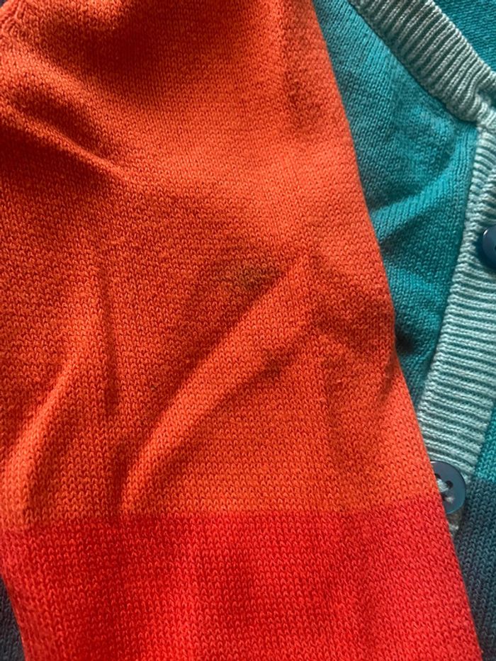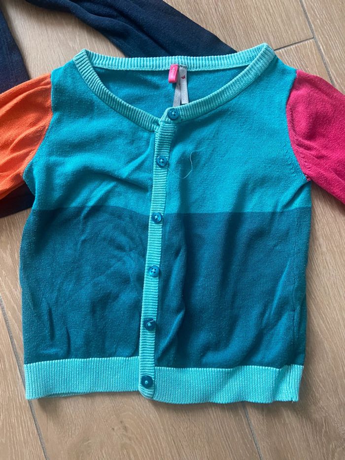 2 gilets 4 ans souvent porté Bleu marine (gemo) manque un bouton Multicolore (orchestra) à une tache Voir photo #quatreansfille_anais