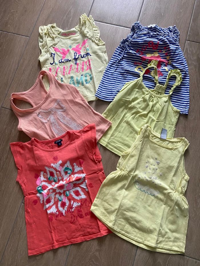 Lot de 6 debardeurs 3 ans Le rose orangé et le jaune avec les oiseaux roses sont un peu bouloches Les autres en bon état général #troisansfille_anais