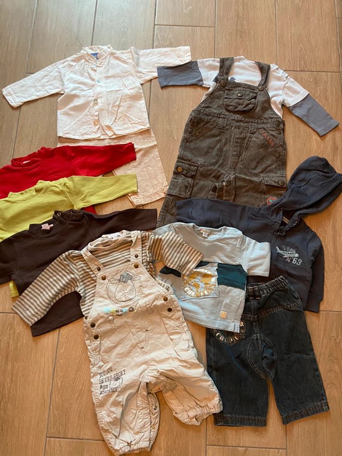Lot de 12 pièces, différentes marques, 9 mois comprenant: 2 salopettes 2 pantalons 1 gilet 6 haut ML 1 chemise ML #neufmoisgarcon_anais